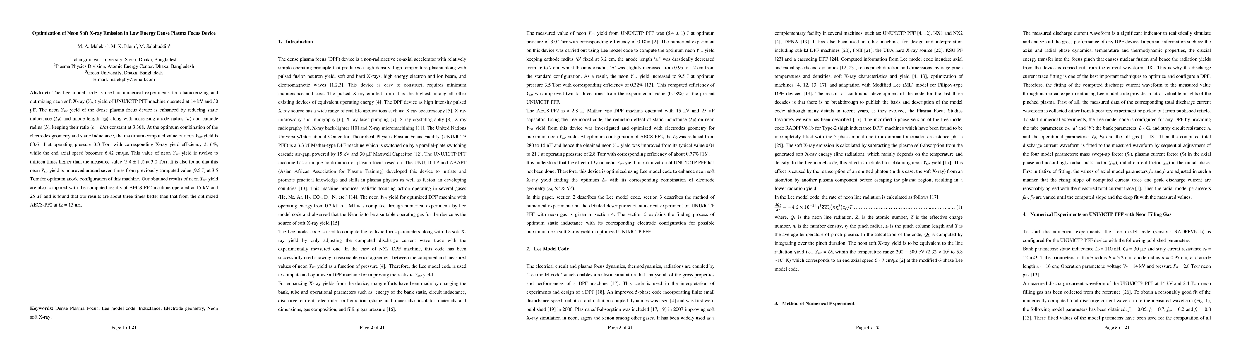 This study optimizes neon soft X-ray emission in a dense plasma focus device using the Lee model code, achieving a 63.61 J yield by adjusting electrode geometry and static inductance. The results show a significant improvement over previous measurements and other similar machines.