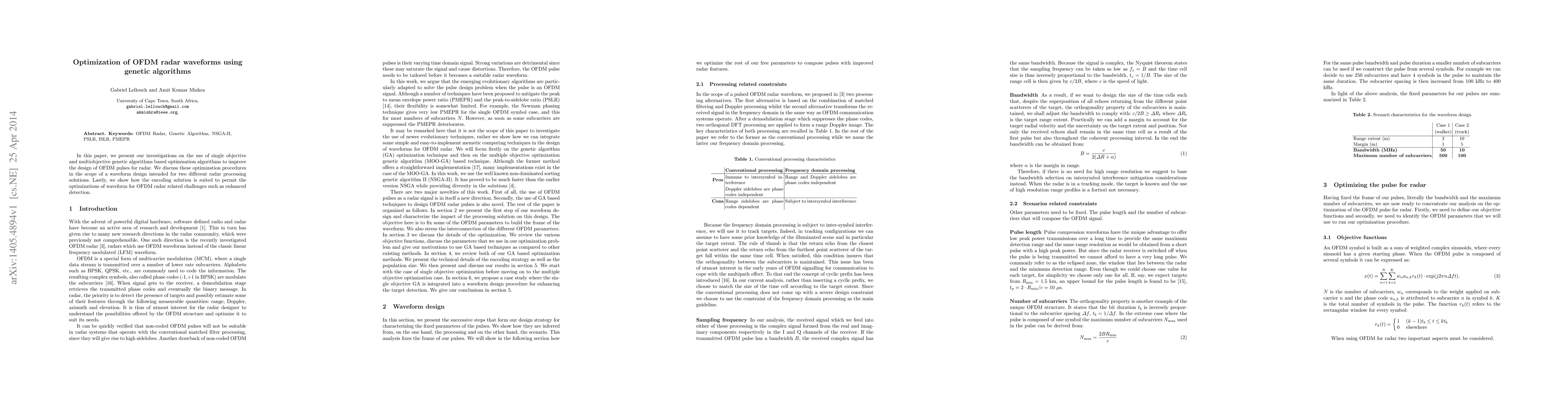 This paper explores the application of genetic algorithms for optimizing OFDM radar waveforms, employing both single and multiobjective approaches to enhance radar design. The study demonstrates how these optimizations address challenges such as improved detection in radar processing.