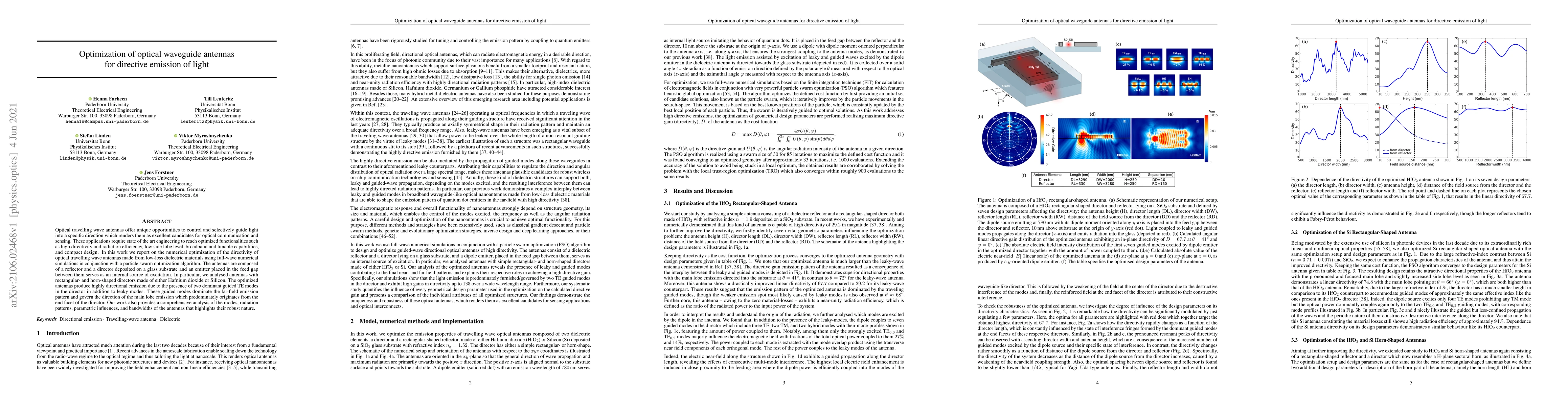 This paper optimizes the directivity of optical travelling wave antennas using numerical simulations and particle swarm optimization, focusing on low-loss dielectric materials with reflectors, directors, and emitters. The optimized antennas achieve highly directional emission, primarily from the end facet of the director, due to dominant guided TE and leaky modes.