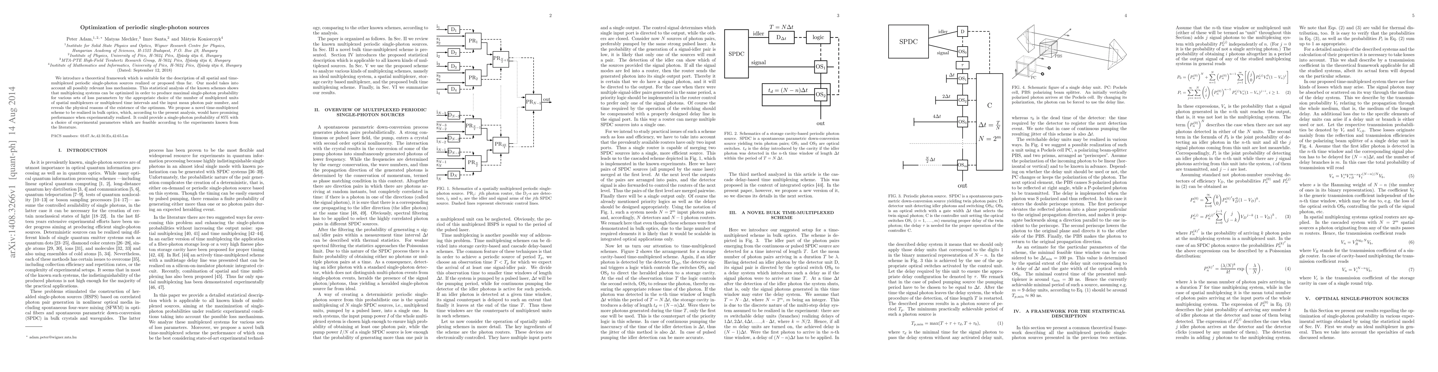 This research develops a theoretical framework for optimizing periodic single-photon sources, demonstrating that through appropriate multiplexing, systems can achieve maximal single-photon probabilities despite losses. The study proposes a new time-multiplexed scheme in bulk optics with a potential 85% single-photon probability under feasible experimental conditions.