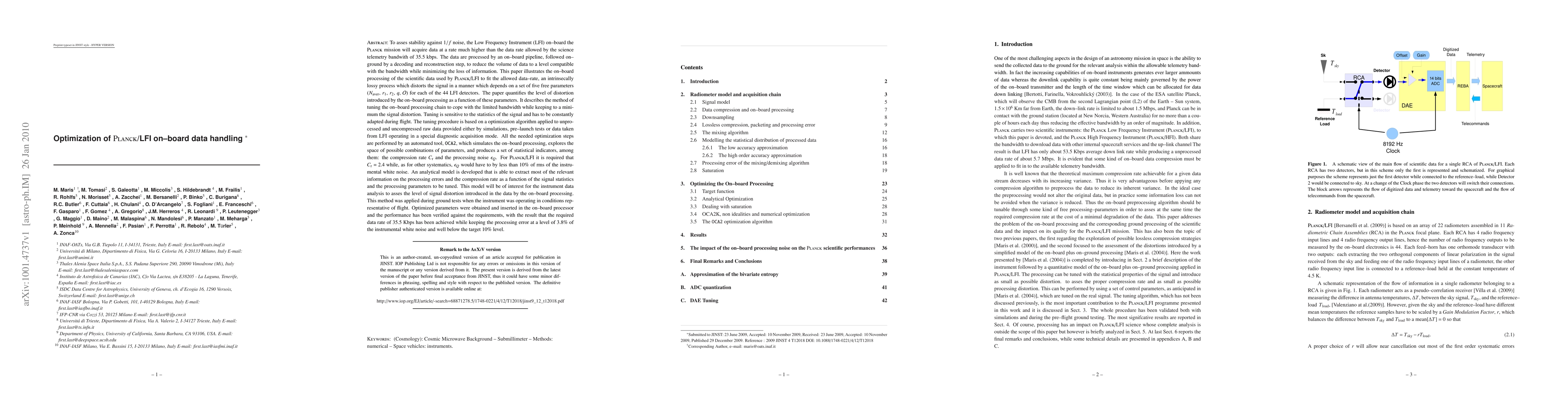 This paper details the optimization of onboard data handling for the Planck mission's Low Frequency Instrument (LFI) to manage high-rate data within a limited telemetry bandwidth. It introduces an automated optimization tool, OCA2, to fine-tune parameters and achieve a compression rate of 2.4 while maintaining distortion levels below 10% of the instrumental noise, ultimately meeting mission requirements.