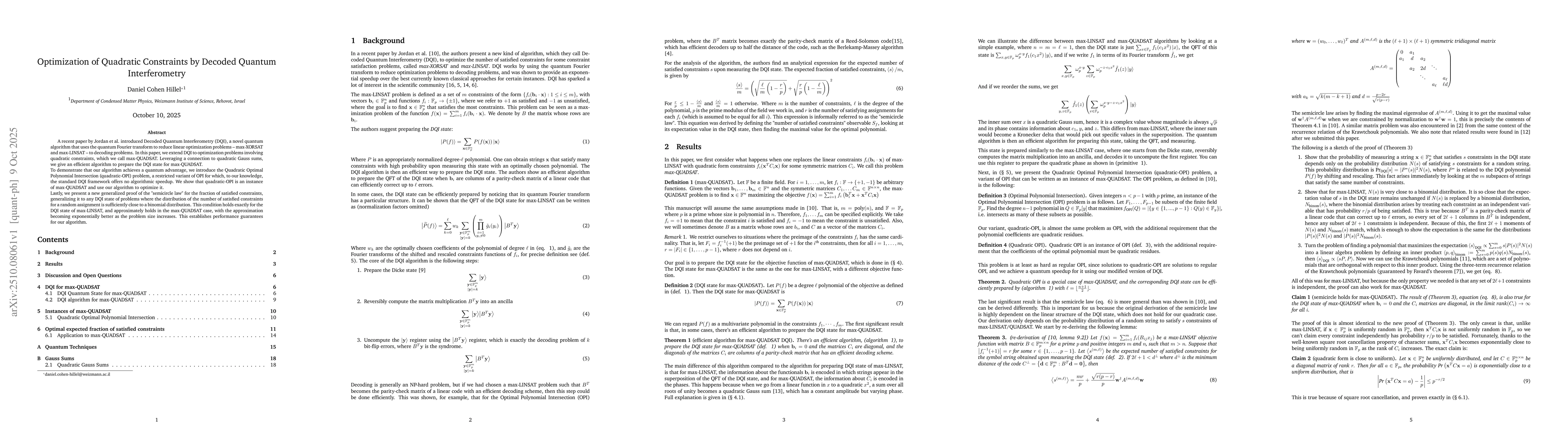 A recent paper by Jordan et al. introduced Decoded Quantum Interferometry (DQI), a novel quantum algorithm that uses the quantum Fourier transform to reduce linear optimization problems -- max-XORSAT and max-LINSAT -- to decoding problems. In this paper, we extend DQI to optimization problems involving quadratic constraints, which we call max-QUADSAT. Leveraging a connection to quadratic Gauss sums, we give an efficient algorithm to prepare the DQI state for max-QUADSAT. To demonstrate that our algorithm achieves a quantum advantage, we introduce the Quadratic Optimal Polynomial Intersection (quadratic-OPI) problem, a restricted variant of OPI for which, to our knowledge, the standard DQI framework offers no algorithmic speedup. We show that quadratic-OPI is an instance of max-QUADSAT and use our algorithm to optimize it. Lastly, we present a new generalized proof of the "semicircle law" for the fraction of satisfied constraints, generalizing it to any DQI state of problems where the distribution of the number of satisfied constraints for a random assignment is sufficiently close to a binomial distribution. This condition holds exactly for the DQI state of max-LINSAT, and approximately holds in the max-QUADSAT case, with the approximation becoming exponentially better as the problem size increases. This establishes performance guarantees for our algorithm.