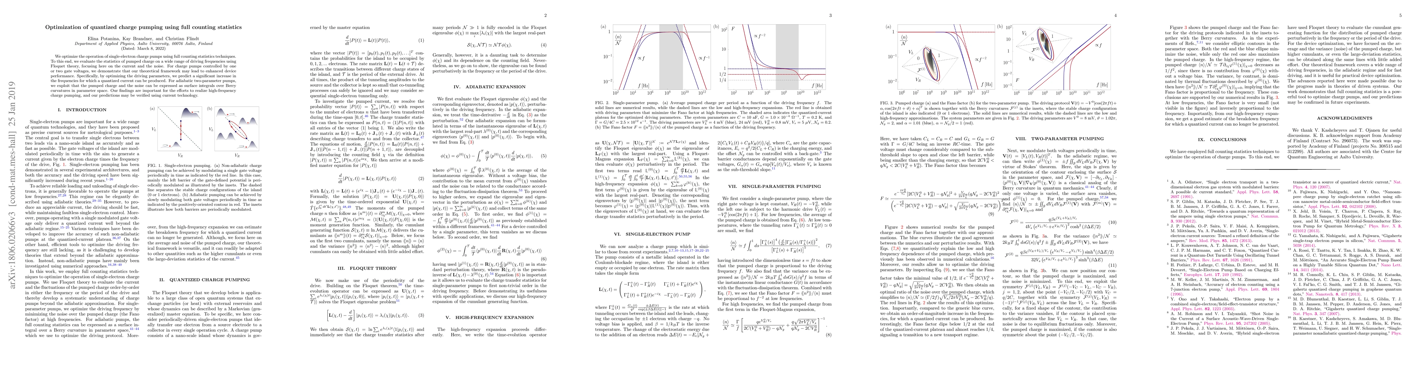 This paper optimizes single-electron charge pumps using full counting statistics, demonstrating enhanced performance through theoretical frameworks. It predicts significant increases in quantized current frequencies by optimizing driving parameters, particularly in adiabatic two-parameter pumps.
