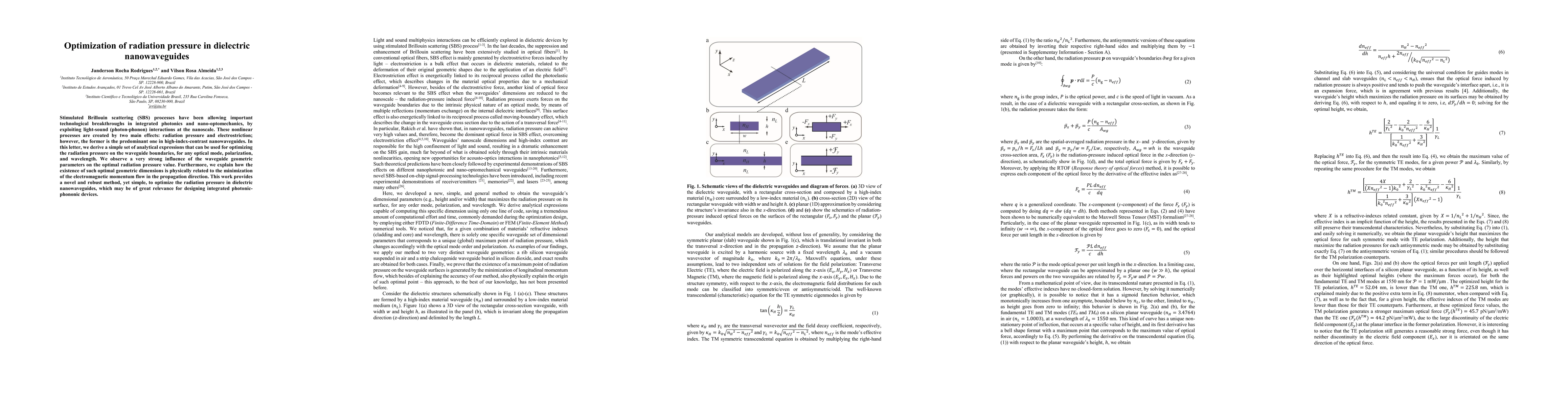 Stimulated Brillouin scattering (SBS) processes have been allowing important technological breakthroughs in integrated photonics and nano-optomechanics, by exploiting light-sound (photon-phonon) interactions at the nanoscale. These nonlinear processes are created by two main effects: radiation pressure and electrostriction; however, the former is the predominant one in high-index-contrast nanowaveguides. In this letter, we derive a simple set of analytical expressions that can be used for optimizing the radiation pressure on the waveguide boundaries, for any optical mode, polarization, and wavelength. We observe a very strong influence of the waveguide geometric parameters on the optimal radiation pressure value. Furthermore, we explain how the existence of such optimal geometric dimensions is physically related to the minimization of the electromagnetic momentum flow in the propagation direction. This work provides a novel and robust method, yet simple, to optimize the radiation pressure in dielectric nanowaveguides, which may be of great relevance for designing integrated photonic-phononic devices.