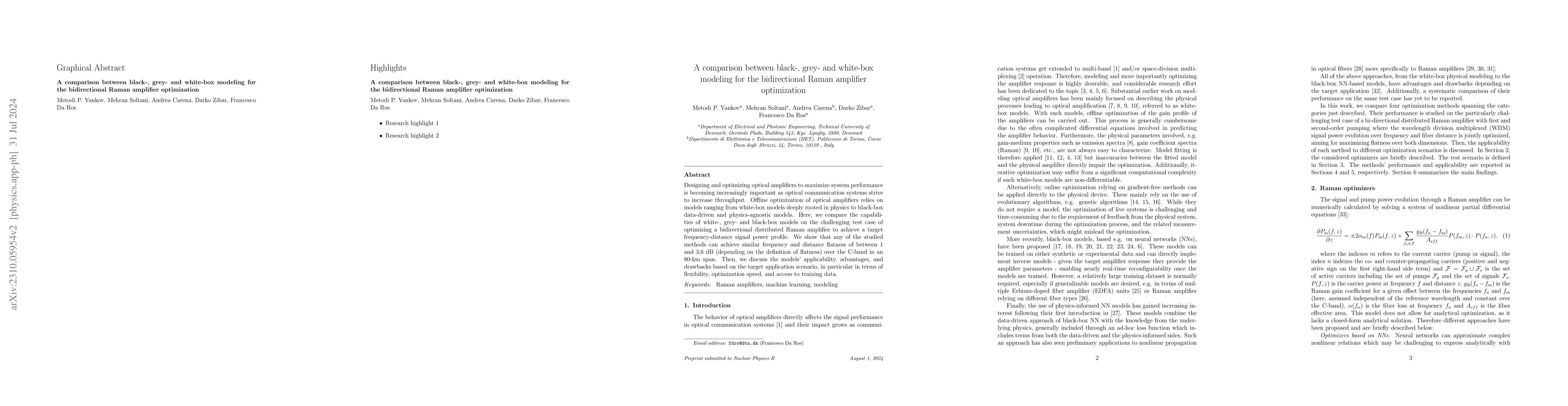 This paper compares the effectiveness of white-, grey-, and black-box modeling techniques for optimizing Raman amplifiers, demonstrating that all methods can achieve 1 dB of frequency-distance flatness over a 100-km span. It discusses the models' respective advantages and drawbacks, particularly regarding optimization speed and data availability.