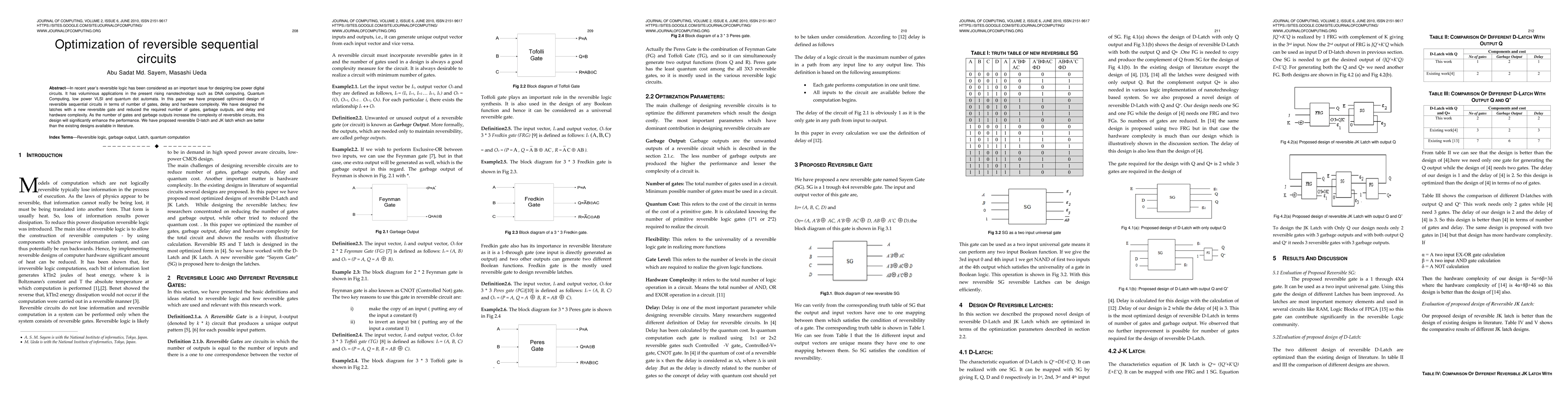 This paper proposes optimized designs for reversible sequential circuits, specifically D-latch and JK latch, using a new reversible gate to reduce the number of gates, garbage outputs, and delay, thereby enhancing performance and lowering hardware complexity for low power digital circuit applications.