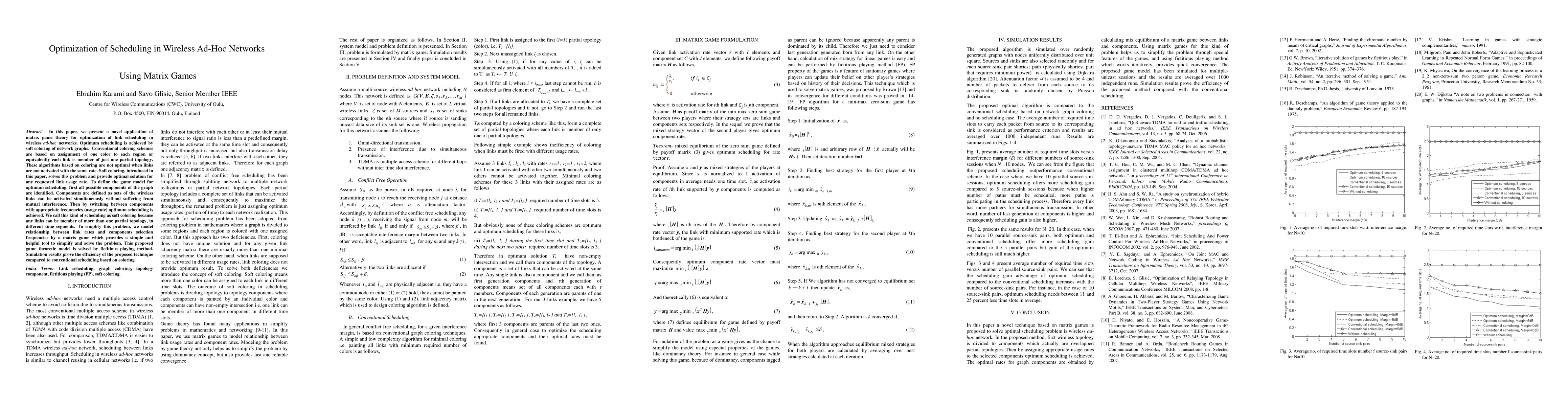 This paper introduces matrix game theory for optimizing link scheduling in wireless ad-hoc networks through soft coloring, which allows links to belong to multiple partial topologies at different times, providing an optimal solution for varying link usage rates. The proposed matrix game model simplifies the scheduling problem and is solved using a fictitious playing method, demonstrating improved efficiency over traditional coloring-based methods.