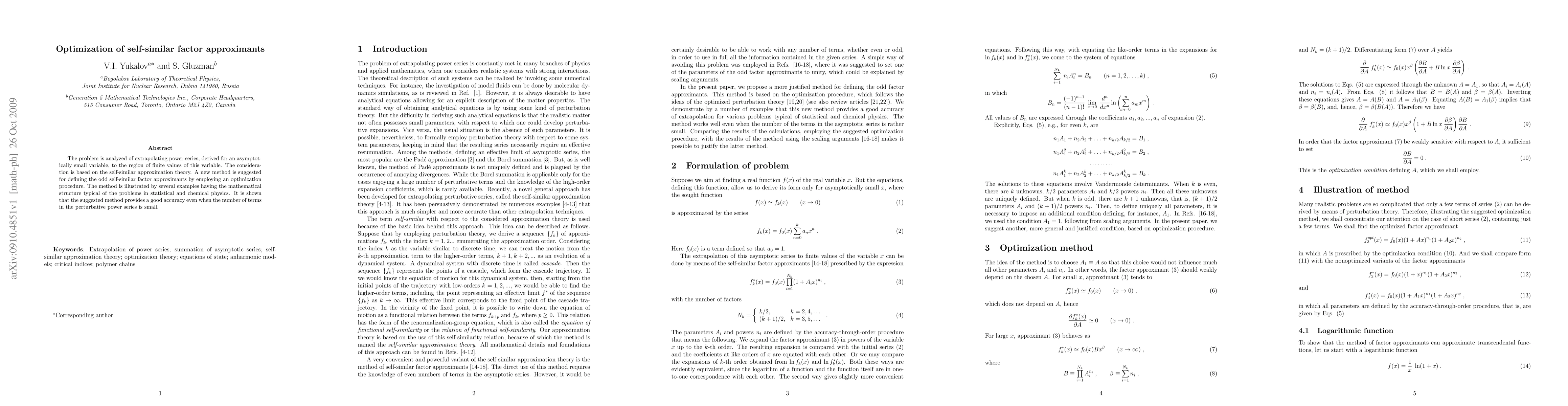 The problem is analyzed of extrapolating power series, derived for an asymptotically small variable, to the region of finite values of this variable. The consideration is based on the self-similar approximation theory. A new method is suggested for defining the odd self-similar factor approximants by employing an optimization procedure. The method is illustrated by several examples having the mathematical structure typical of the problems in statistical and chemical physics. It is shown that the suggested method provides a good accuracy even when the number of terms in the perturbative power series is small.