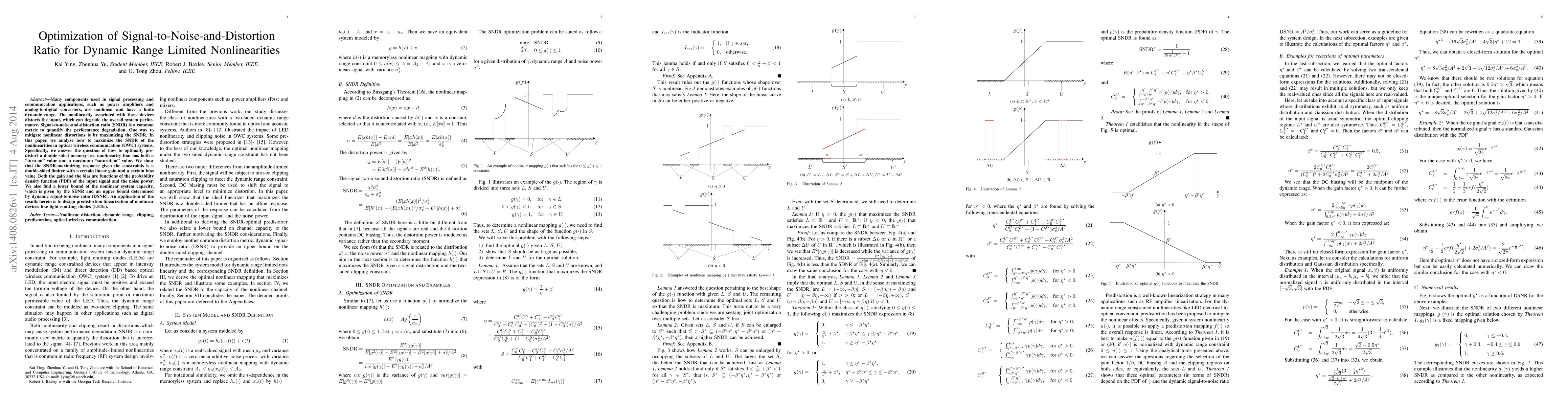 Many components used in signal processing and communication applications, such as power amplifiers and analog-to-digital converters, are nonlinear and have a finite dynamic range. The nonlinearity associated with these devices distorts the input, which can degrade the overall system performance. Signal-to-noise-and-distortion ratio (SNDR) is a common metric to quantify the performance degradation. One way to mitigate nonlinear distortions is by maximizing the SNDR. In this paper, we analyze how to maximize the SNDR of the nonlinearities in optical wireless communication (OWC) systems. Specifically, we answer the question of how to optimally predistort a double-sided memory-less nonlinearity that has both a "turn-on" value and a maximum "saturation" value. We show that the SNDR-maximizing response given the constraints is a double-sided limiter with a certain linear gain and a certain bias value. Both the gain and the bias are functions of the probability density function (PDF) of the input signal and the noise power. We also find a lower bound of the nonlinear system capacity, which is given by the SDNR and an upper bound determined by dynamic signal-to-noise ratio (DSNR). An application of the results herein is to design predistortion linearization of nonlinear devices like light emitting diodes (LEDs).