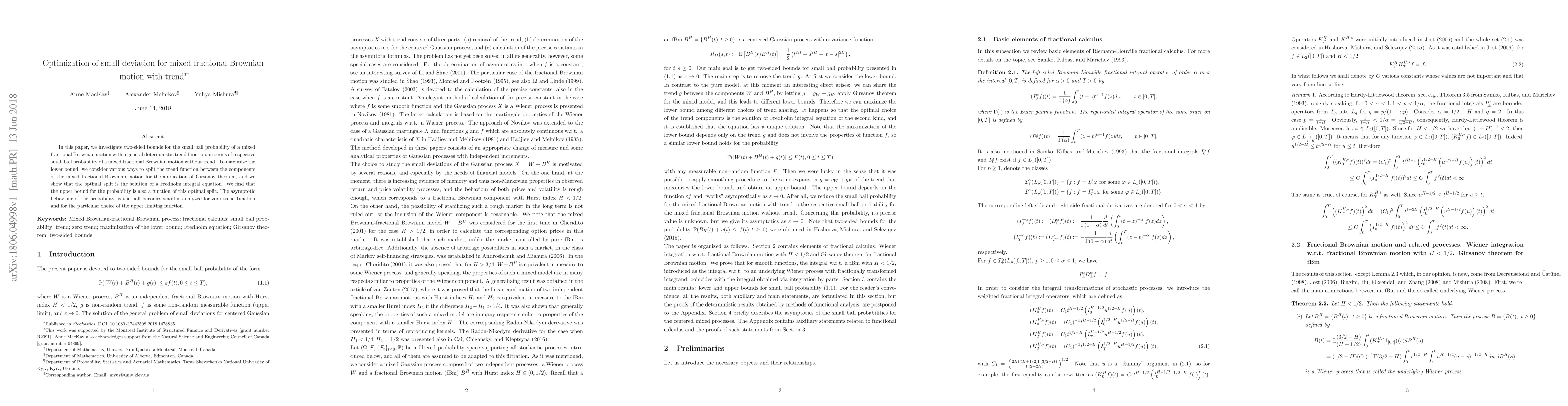 This paper establishes two-sided bounds for the small ball probability of mixed fractional Brownian motion with a deterministic trend, comparing it to the same probability without a trend. The optimal way to split the trend function is found to solve a Fredholm integral equation, influencing both the lower and upper bounds.