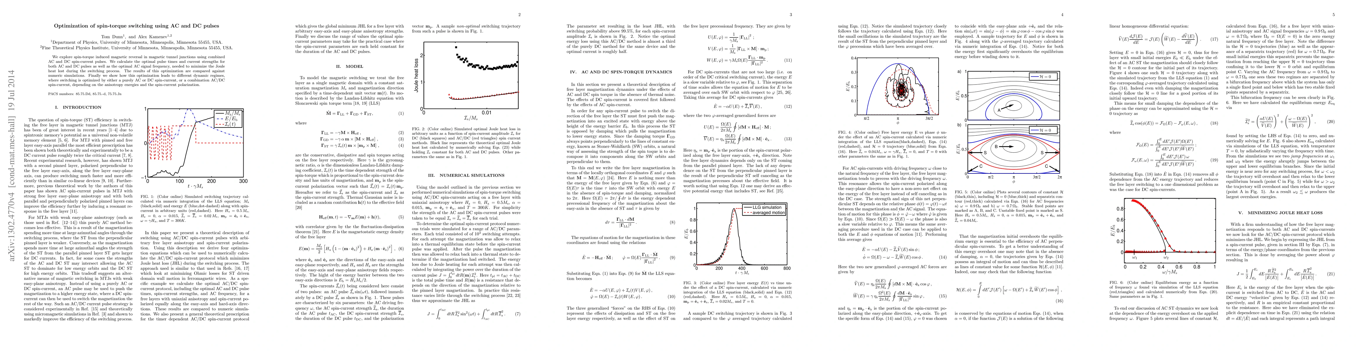 This paper investigates optimizing spin-torque switching in magnetic tunnel junctions using combined AC and DC pulses to minimize Joule heating. It determines optimal pulse parameters and signal frequency, demonstrating different dynamic regimes based on anisotropy energies and spin-current polarization.