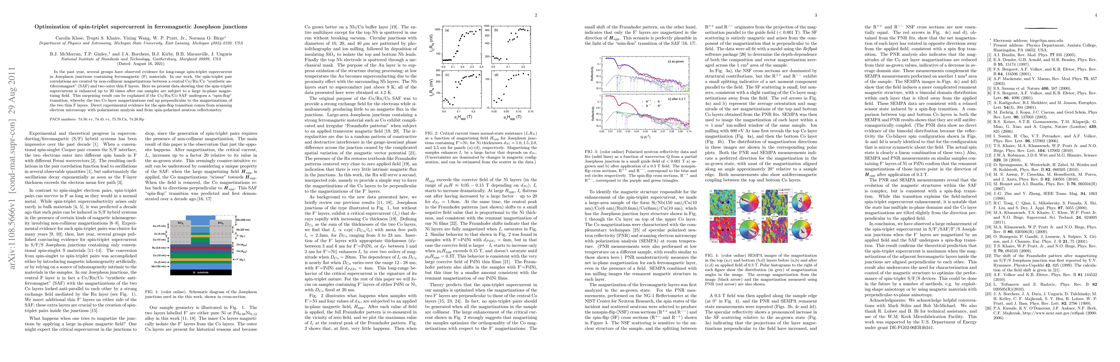 In the past year, several groups have observed evidence for long-range spin-triplet supercurrent in Josephson junctions containing ferromagnetic (F) materials. In our work, the spin-triplet pair correlations are created by non-collinear magnetizations between a central Co/Ru/Co "synthetic antiferromagnet" (SAF) and two outer thin F layers. Here we present data showing that the spin-triplet supercurrent is enhanced up to 20 times after our samples are subject to a large in-plane magnetizing field. This surprising result can be explained if the Co/Ru/Co SAF undergoes a "spin-flop" transition, whereby the two Co layer magnetizations end up perpendicular to the magnetizations of the two thin F layers. Direct experimental evidence for the spin-flop transition comes from scanning electron microscopy with polarization analysis and from spin-polarized neutron reflectometry.