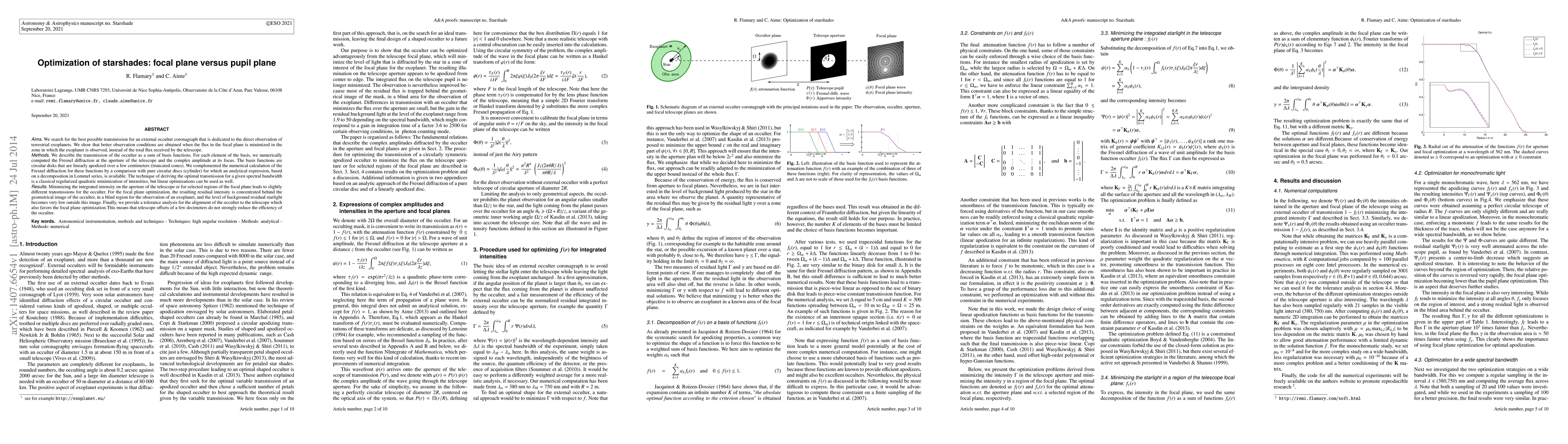 This paper investigates the optimization of starshades for exoplanet observation, finding that minimizing flux in the focal plane where the exoplanet is observed yields better observation conditions than minimizing total telescope flux. The study uses numerical and analytical methods to determine the optimal occulter transmission, showing that focal plane optimization concentrates residual starlight behind the occulter, reducing background noise and maintaining efficiency despite telescope misalignments.