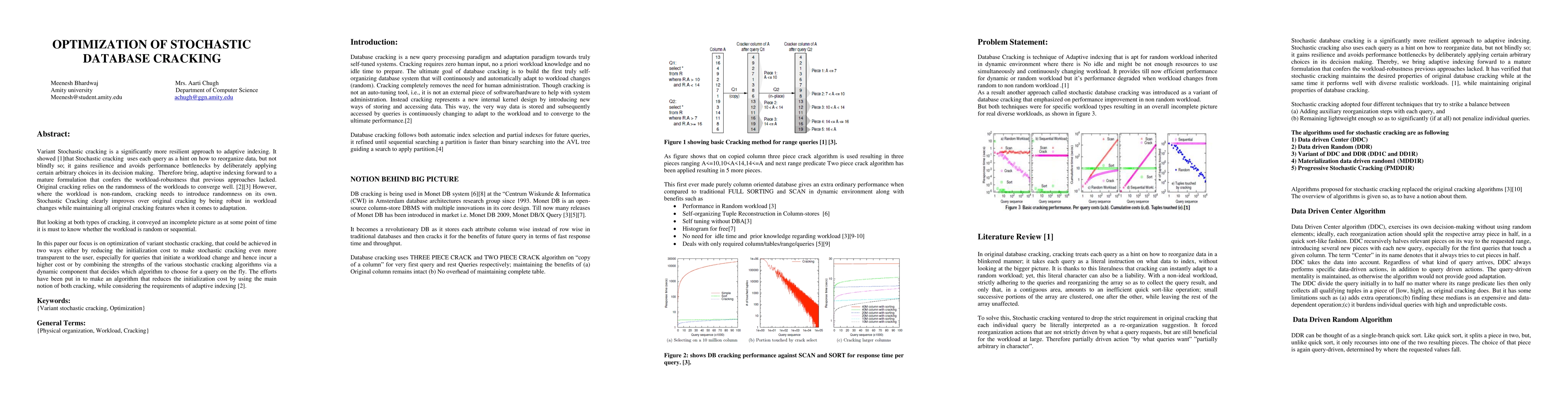 Variant Stochastic cracking is a significantly more resilient approach to adaptive indexing. It showed [1]that Stochastic cracking uses each query as a hint on how to reorganize data, but not blindly so; it gains resilience and avoids performance bottlenecks by deliberately applying certain arbitrary choices in its decision making. Therefore bring, adaptive indexing forward to a mature formulation that confers the workload-robustness that previous approaches lacked. Original cracking relies on the randomness of the workloads to converge well. [2][3] However, where the workload is non-random, cracking needs to introduce randomness on its own. Stochastic Cracking clearly improves over original cracking by being robust in workload changes while maintaining all original cracking features when it comes to adaptation. But looking at both types of cracking, it conveyed an incomplete picture as at some point of time it is must to know whether the workload is random or sequential. In this paper our focus is on optimization of variant stochastic cracking, that could be achieved in two ways either by reducing the initialization cost to make stochastic cracking even more transparent to the user, especially for queries that initiate a workload change and hence incur a higher cost or by combining the strengths of the various stochastic cracking algorithms via a dynamic component that decides which algorithm to choose for a query on the fly. The efforts have been put in to make an algorithm that reduces the initialization cost by using the main notion of both cracking, while considering the requirements of adaptive indexing [2].