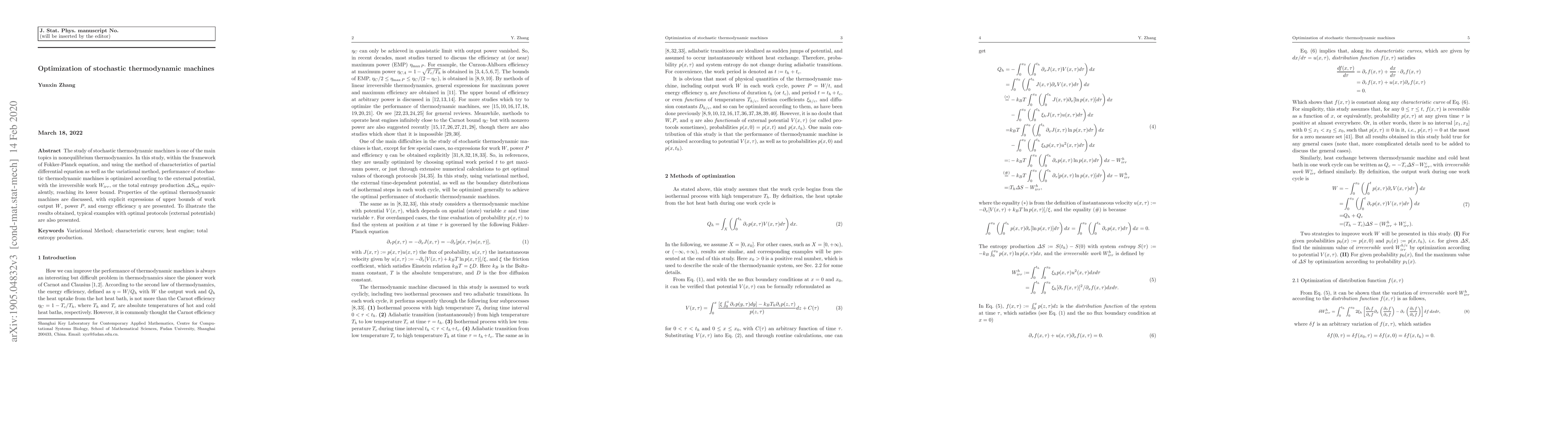 The study of stochastic thermodynamic machines is one of the main topics in nonequilibrium thermodynamics. In this study, within the framework of Fokker-Planck equation, and using the method of characteristics of partial differential equation as well as the variational method, performance of stochastic thermodynamic machines is optimized according to the external potential, with the irreversible work $W_{irr}$, or the total entropy production $\Delta S_{\rm tot}$ equivalently, reaching its lower bound. Properties of the optimal thermodynamic machines are discussed, with explicit expressions of upper bounds of work output $W$, power $P$, and energy efficiency $\eta$ are presented. To illustrate the results obtained, typical examples with optimal protocols (external potentials) are also presented.