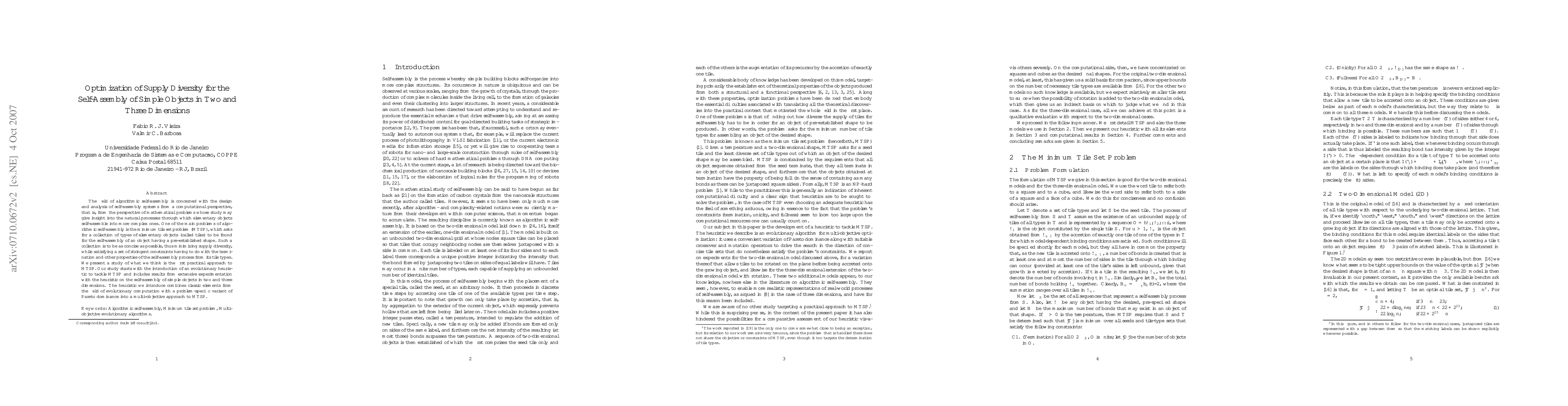 The field of algorithmic self-assembly is concerned with the design and analysis of self-assembly systems from a computational perspective, that is, from the perspective of mathematical problems whose study may give insight into the natural processes through which elementary objects self-assemble into more complex ones. One of the main problems of algorithmic self-assembly is the minimum tile set problem (MTSP), which asks for a collection of types of elementary objects (called tiles) to be found for the self-assembly of an object having a pre-established shape. Such a collection is to be as concise as possible, thus minimizing supply diversity, while satisfying a set of stringent constraints having to do with the termination and other properties of the self-assembly process from its tile types. We present a study of what we think is the first practical approach to MTSP. Our study starts with the introduction of an evolutionary heuristic to tackle MTSP and includes results from extensive experimentation with the heuristic on the self-assembly of simple objects in two and three dimensions. The heuristic we introduce combines classic elements from the field of evolutionary computation with a problem-specific variant of Pareto dominance into a multi-objective approach to MTSP.