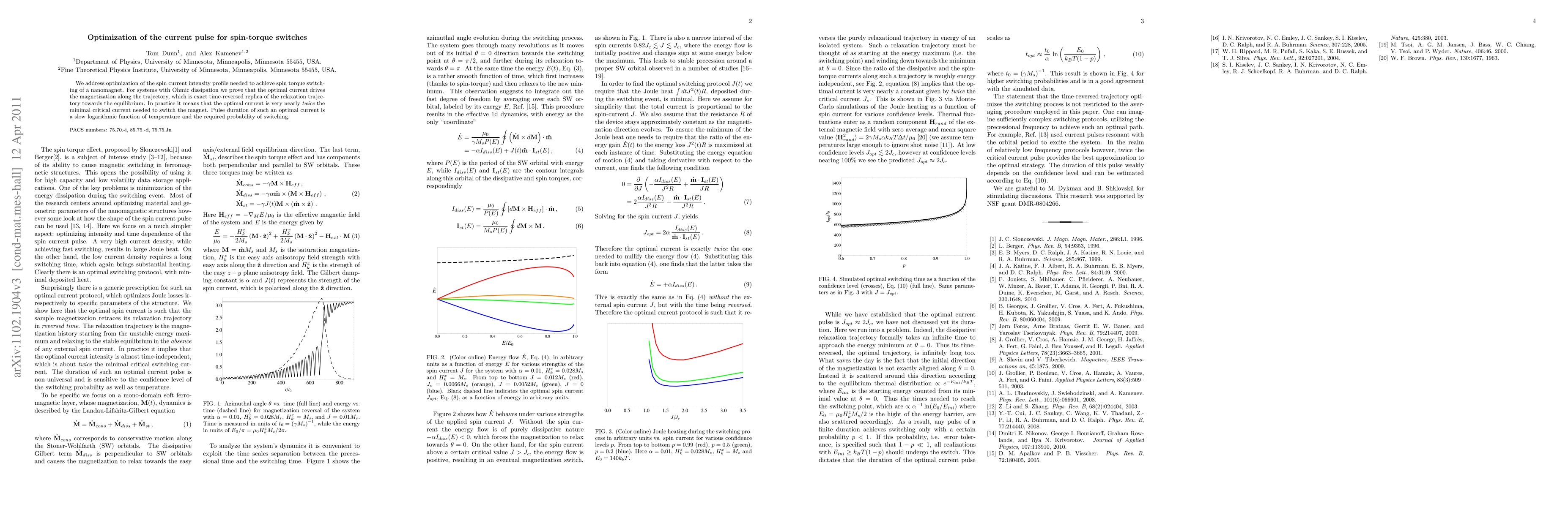 We address optimization of the spin current intensity profile needed to achieve spin torque switching of a nanomagnet. For systems with Ohmic dissipation we prove that the optimal current drives the magnetization along the trajectory, which is exact time-reversed replica of the relaxation trajectory towards the equilibrium. In practice it means that the optimal current is very nearly {\em twice} the minimal critical current needed to switch the magnet. Pulse duration of such an optimal current is a slow logarithmic function of temperature and the required probability of switching.