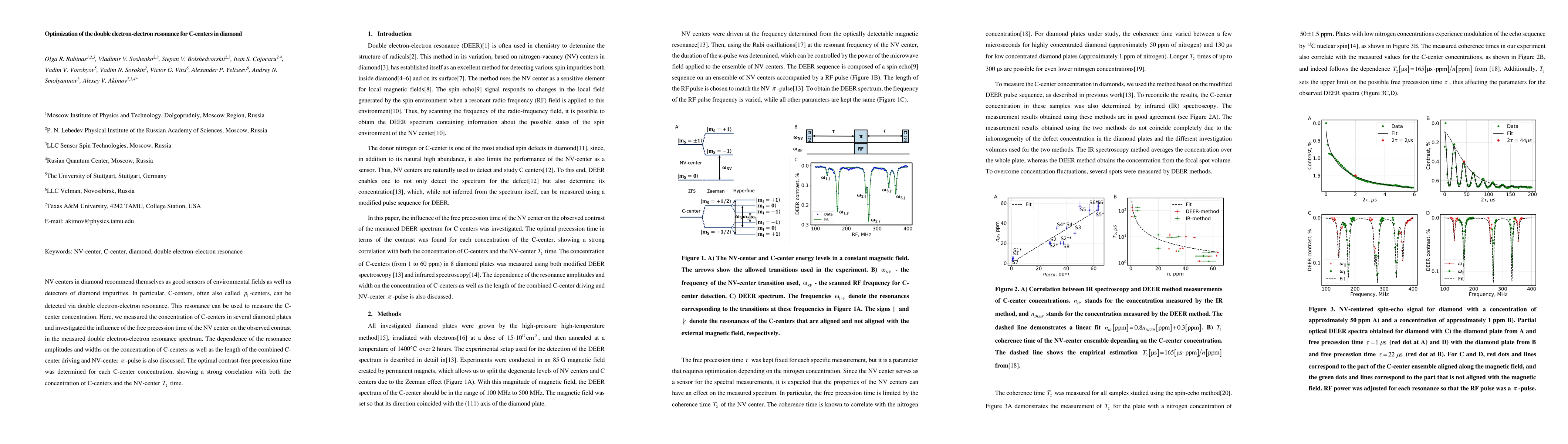 This paper optimizes double electron-electron resonance for detecting C-centers in diamond, finding the optimal free precession time for NV centers to maximize contrast in the resonance spectrum. The study correlates the optimal precession time with C-center concentration and NV center's $T_2$ time.
