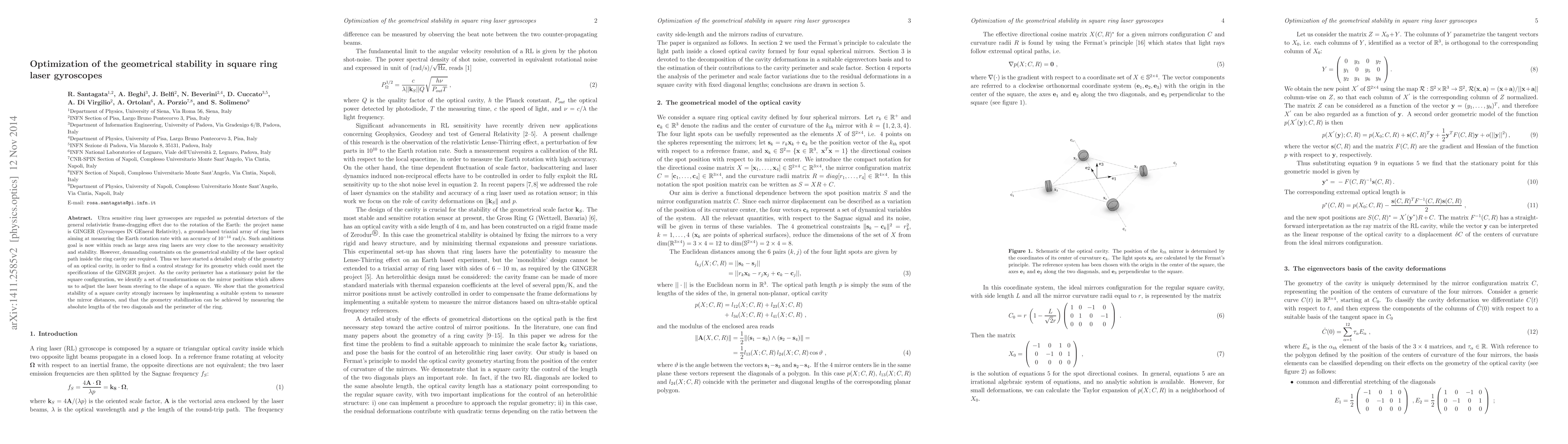Researchers optimized the geometry of square ring laser gyroscopes to achieve high sensitivity and stability for detecting the Earth's rotation rate with accuracy of 10^-14 rad/s. By measuring mirror distances, they found a control strategy to stabilize the laser optical path.