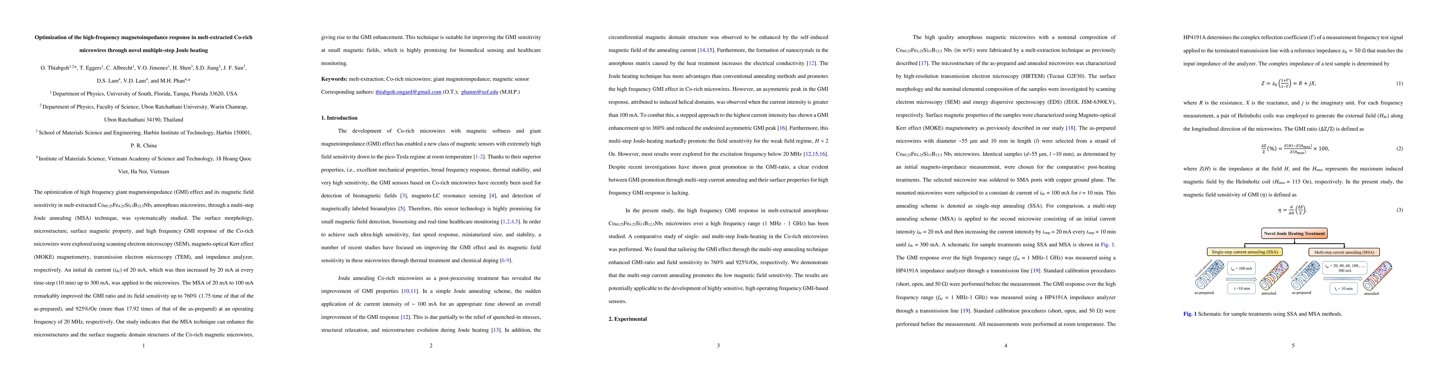 This study optimizes the high-frequency giant magnetoimpedance (GMI) effect in Co-rich microwires via a multi-step Joule annealing technique, achieving a 760% improvement in GMI ratio and 925%/Oe in magnetic field sensitivity. The technique enhances microstructures and surface magnetic domains, promising for biomedical sensing and healthcare monitoring.