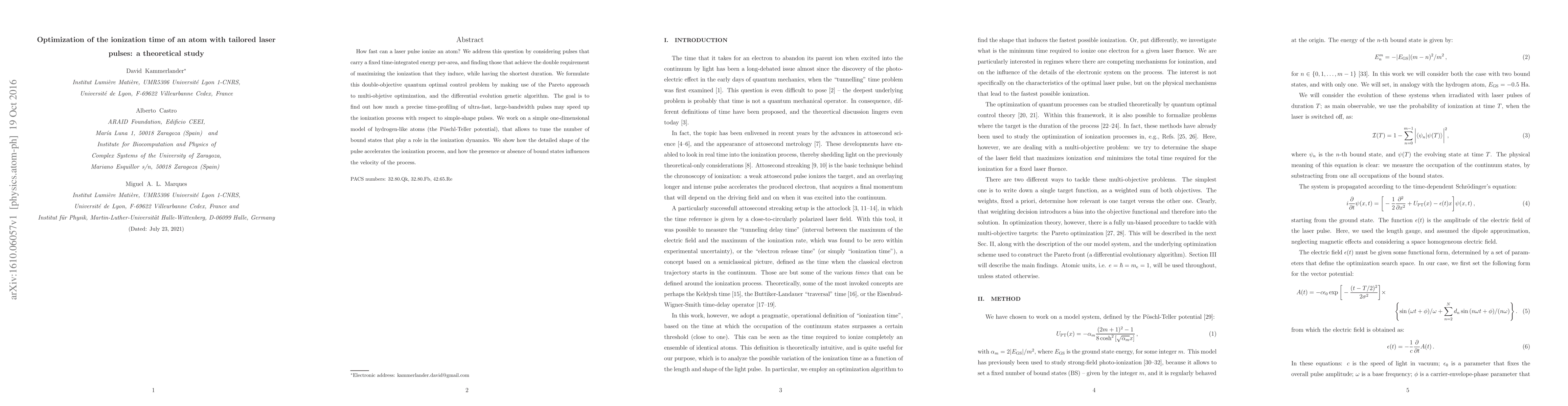 How fast can a laser pulse ionize an atom? We address this question by considering pulses that carry a fixed time-integrated energy per-area, and finding those that achieve the double requirement of maximizing the ionization that they induce, while having the shortest duration. We formulate this double-objective quantum optimal control problem by making use of the Pareto approach to multi-objetive optimization, and the differential evolution genetic algorithm. The goal is to find out how much a precise time-profiling of ultra-fast, large-bandwidth pulses may speed up the ionization process with respect to simple-shape pulses. We work on a simple one-dimensional model of hydrogen-like atoms (the P\"oschl-Teller potential), that allows to tune the number of bound states that play a role in the ionization dynamics. We show how the detailed shape of the pulse accelerates the ionization process, and how the presence or absence of bound states influences the velocity of the process.