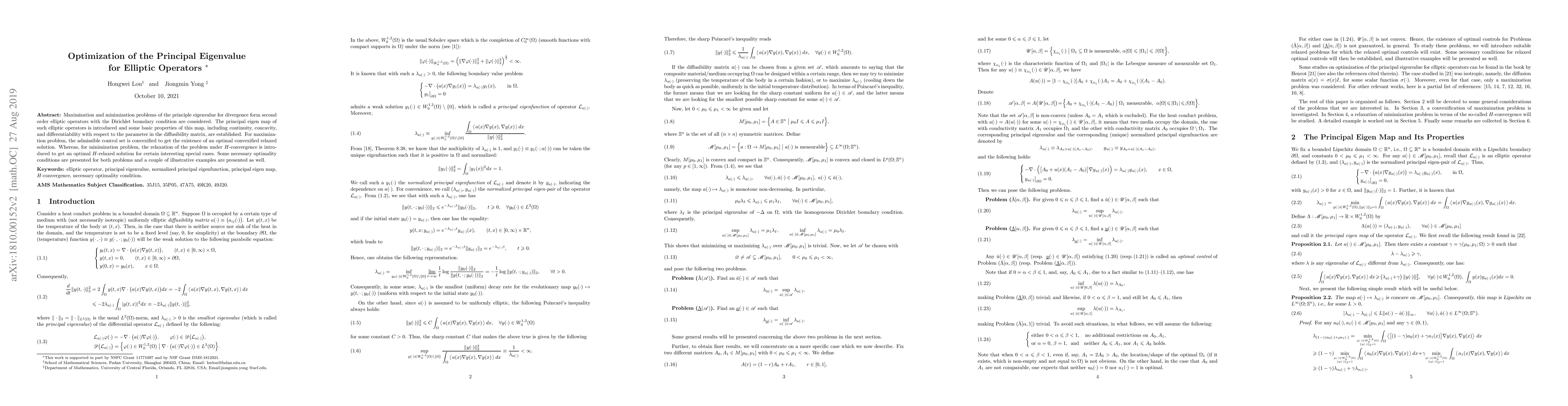 This paper explores optimization problems for the principal eigenvalue of elliptic operators, establishing properties of the principal eigen map and presenting solutions for both maximization and minimization problems. It introduces convexification and relaxation methods to find optimal solutions and provides necessary optimality conditions along with examples.
