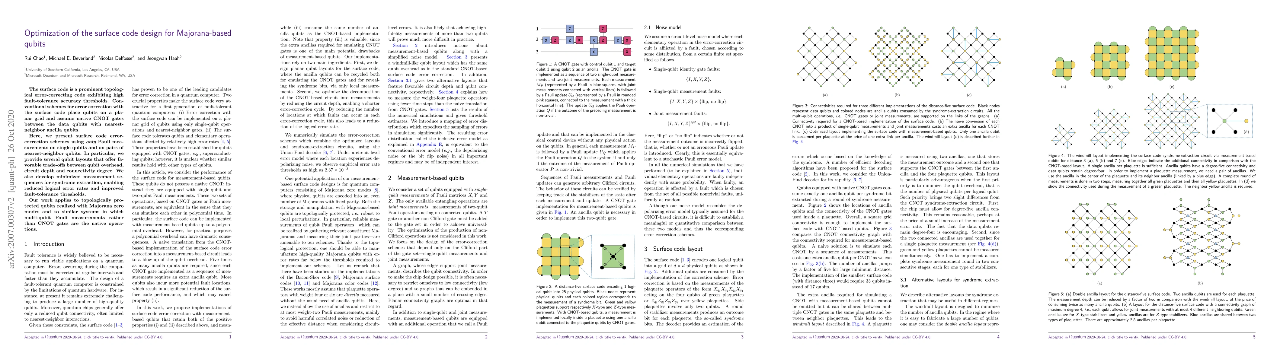This research optimizes surface code design for Majorana-based qubits, proposing schemes that use only single-qubit and nearest-neighbor Pauli measurements for error correction. It presents favorable qubit layouts balancing overhead, depth, and connectivity, along with minimized measurement sequences for syndrome extraction, enhancing fault-tolerance thresholds.