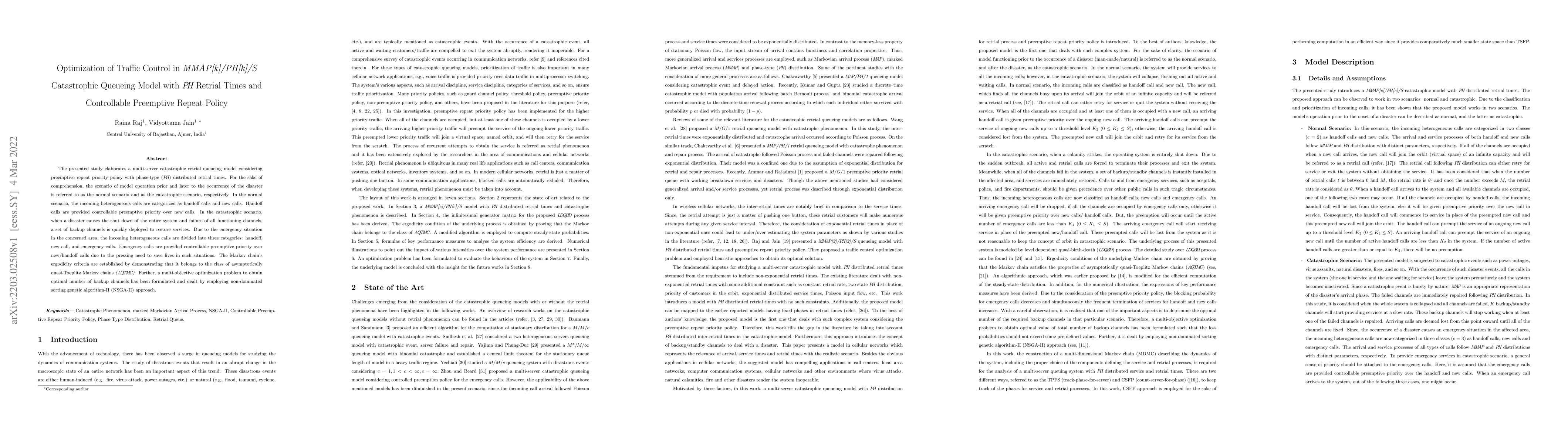The presented study elaborates a multi-server catastrophic retrial queueing model considering preemptive repeat priority policy with phase-type (PH) distributed retrial times. For the sake of comprehension, the scenario of model operation prior and later to the occurrence of the disaster is referred to as the normal scenario and as the catastrophic scenario, respectively. In the normal scenario, the incoming heterogeneous calls are categorized as handoff calls and new calls. Handoff calls are provided controllable preemptive priority over new calls. In the catastrophic scenario, when a disaster causes the shut down of the entire system and failure of all functioning channels, a set of backup channels is quickly deployed to restore services. Due to the emergency situation in the concerned area, the incoming heterogeneous calls are divided into three categories: handoff, new call, and emergency calls. Emergency calls are provided controllable preemptive priority over new/handoff calls due to the pressing need to save lives in such situations. The Markov chain's ergodicity criteria are established by demonstrating that it belongs to the class of asymptotically quasi-Toeplitz Markov chains (AQTMC). Further, a multi-objective optimization problem to obtain optimal number of backup channels has been formulated and dealt by employing non-dominated sorting genetic algorithm-II (NSGA-II) approach.