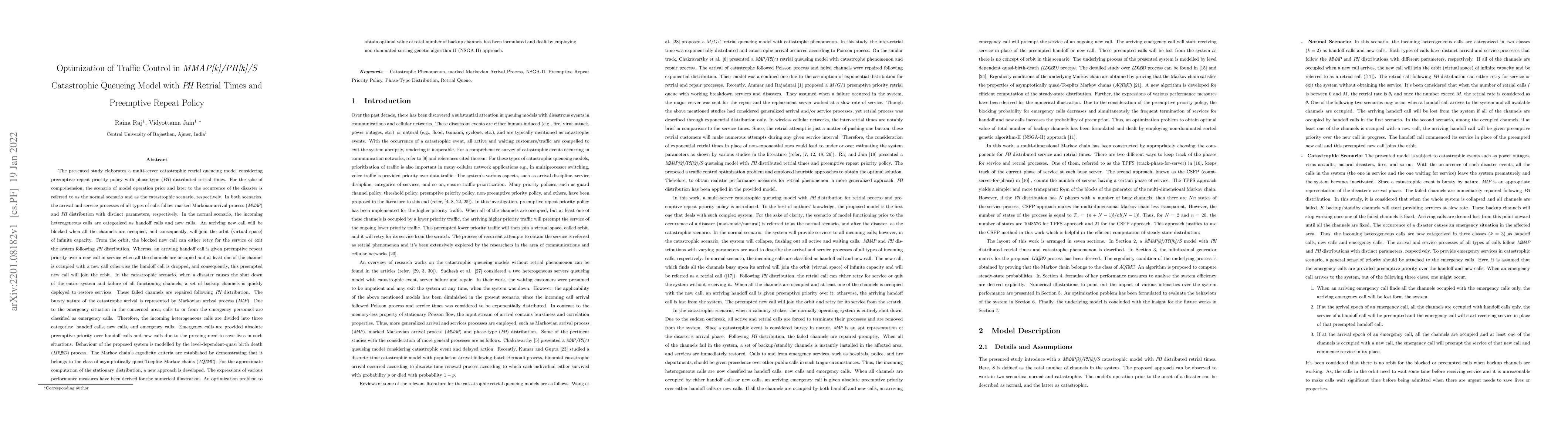 This study optimizes traffic control in a multi-server queueing system with PH distributed retrial times and preemptive repeat priority policy to minimize the number of backup channels required after a disaster, using a genetic algorithm for optimization.