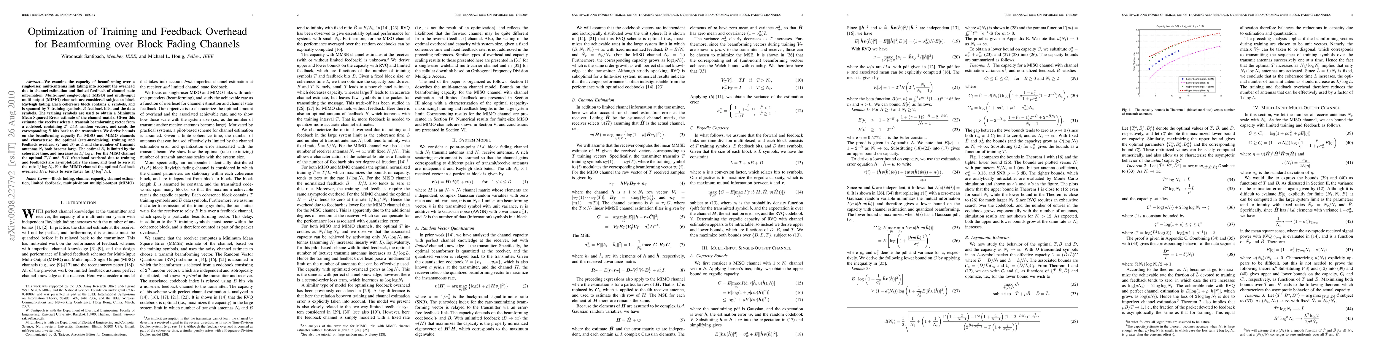 This paper optimizes beamforming training and feedback overhead for single-user, multi-antenna links over block fading channels, deriving capacity bounds for MISO and MIMO systems. It characterizes optimal training and feedback overhead as the number of antennas and coherence block length increase.