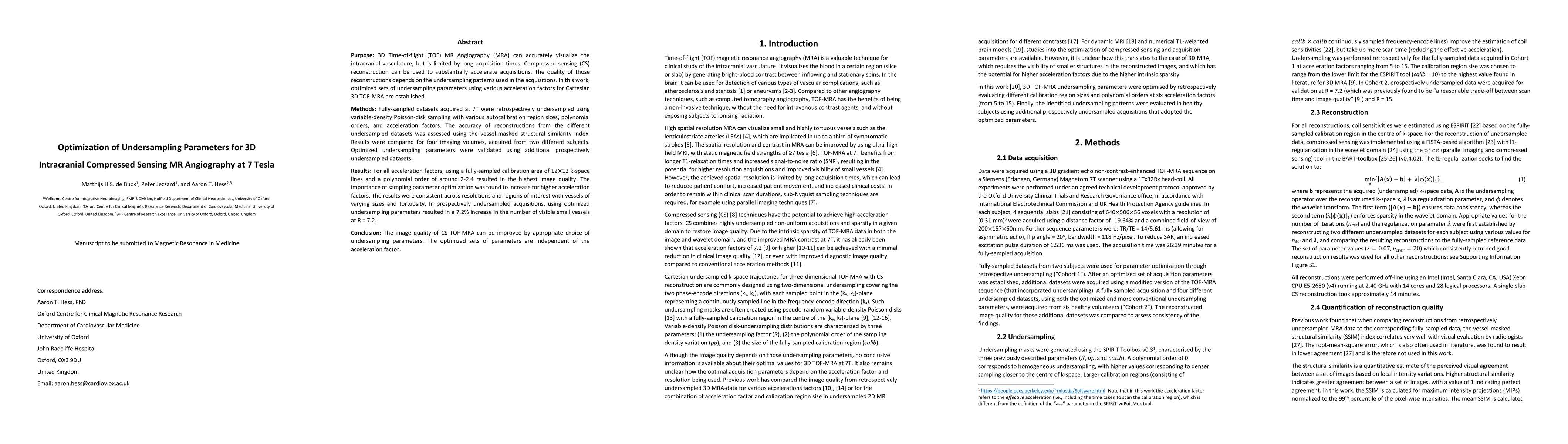 This study optimizes undersampling parameters for 3D TOF-MRA using compressed sensing at 7 Tesla, finding that a calibration area of 12x12 k-space lines and a polynomial order of 2-2.4 yields the best reconstruction quality, especially at higher acceleration factors.