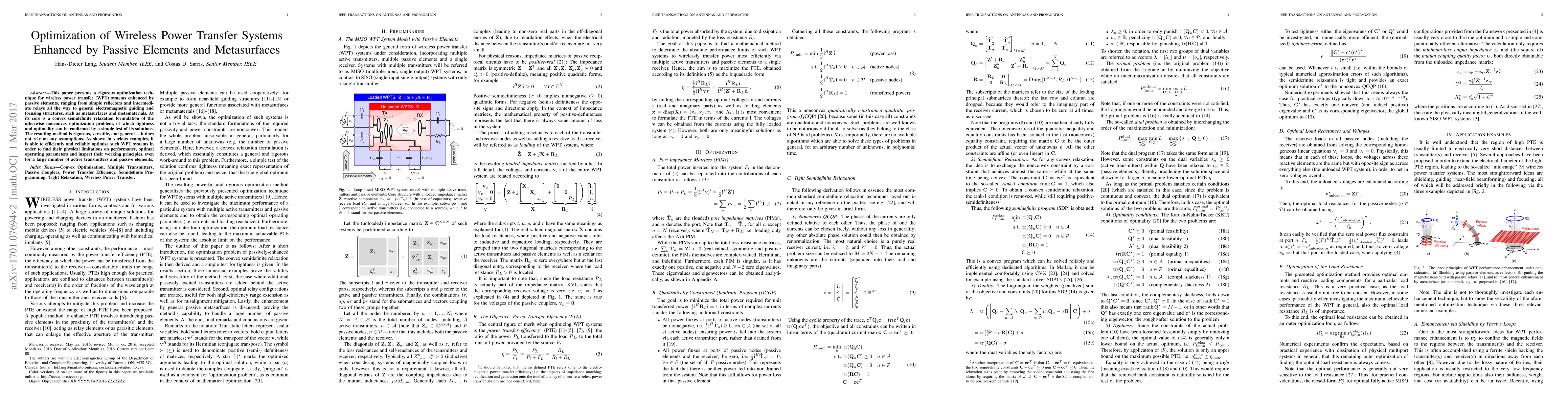 This paper optimizes wireless power transfer systems using passive elements and metasurfaces through a convex semidefinite relaxation technique, offering a versatile and assumption-free method for determining performance limits and optimal parameters. The approach efficiently handles complex systems with multiple transmitters and passive elements.