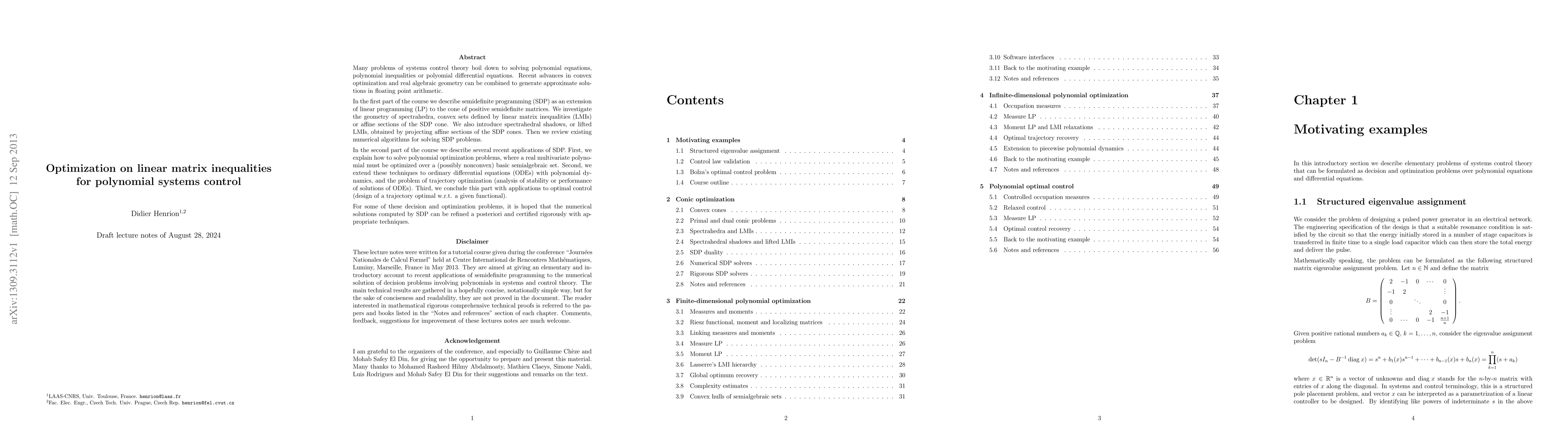 Many problems of systems control theory boil down to solving polynomial equations, polynomial inequalities or polyomial differential equations. Recent advances in convex optimization and real algebraic geometry can be combined to generate approximate solutions in floating point arithmetic. In the first part of the course we describe semidefinite programming (SDP) as an extension of linear programming (LP) to the cone of positive semidefinite matrices. We investigate the geometry of spectrahedra, convex sets defined by linear matrix inequalities (LMIs) or affine sections of the SDP cone. We also introduce spectrahedral shadows, or lifted LMIs, obtained by projecting affine sections of the SDP cones. Then we review existing numerical algorithms for solving SDP problems. In the second part of the course we describe several recent applications of SDP. First, we explain how to solve polynomial optimization problems, where a real multivariate polynomial must be optimized over a (possibly nonconvex) basic semialgebraic set. Second, we extend these techniques to ordinary differential equations (ODEs) with polynomial dynamics, and the problem of trajectory optimization (analysis of stability or performance of solutions of ODEs). Third, we conclude this part with applications to optimal control (design of a trajectory optimal w.r.t. a given functional). For some of these decision and optimization problems, it is hoped that the numerical solutions computed by SDP can be refined a posteriori and certified rigorously with appropriate techniques.