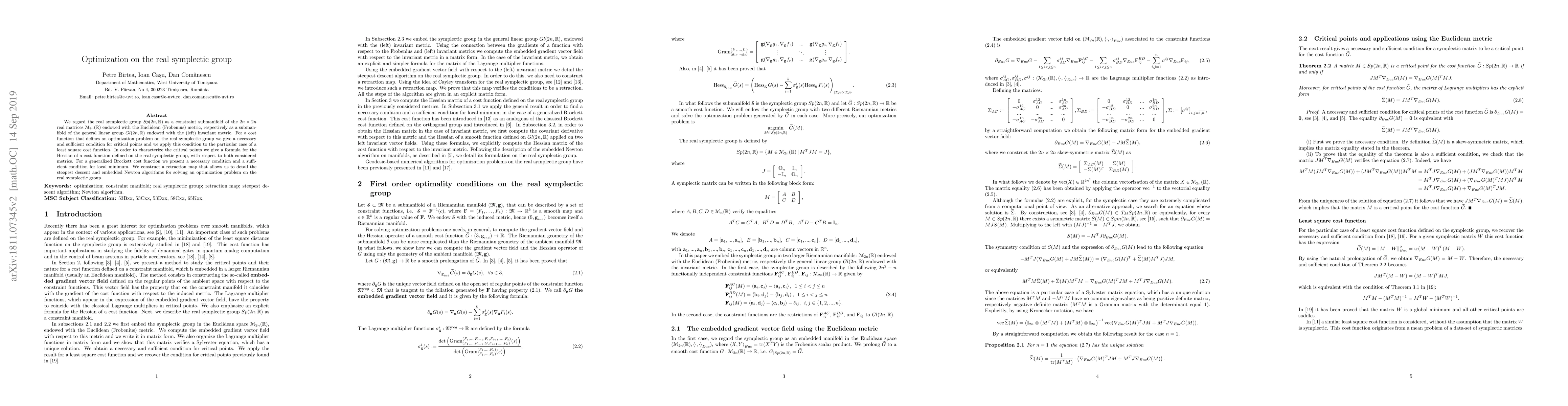 We regard the real symplectic group $Sp(2n,\mathbb{R})$ as a constraint submanifold of the $2n\times 2n$ real matrices $\mathcal{M}_{2n}(\mathbb{R})$ endowed with the Euclidean (Frobenius) metric, respectively as a submanifold of the general linear group $Gl(2n,\mathbb{R})$ endowed with the (left) invariant metric. For a cost function that defines an optimization problem on the real symplectic group we give a necessary and sufficient condition for critical points and we apply this condition to the particular case of a least square cost function. In order to characterize the critical points we give a formula for the Hessian of a cost function defined on the real symplectic group, with respect to both considered metrics. For a generalized Brockett cost function we present a necessary condition and a sufficient condition for local minimum. We construct a retraction map that allows us to detail the steepest descent and embedded Newton algorithms for solving an optimization problem on the real symplectic group.