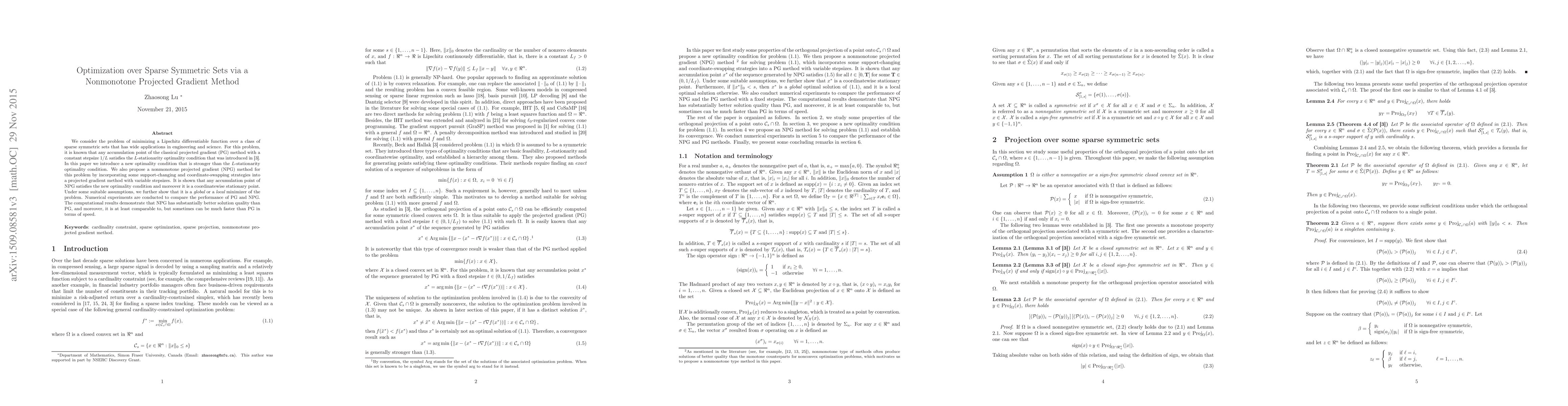 A new optimality condition is introduced for minimizing a function over sparse symmetric sets, and a nonmonotone projected gradient method (NPG) is proposed to achieve better solution quality than the classical projected gradient method.