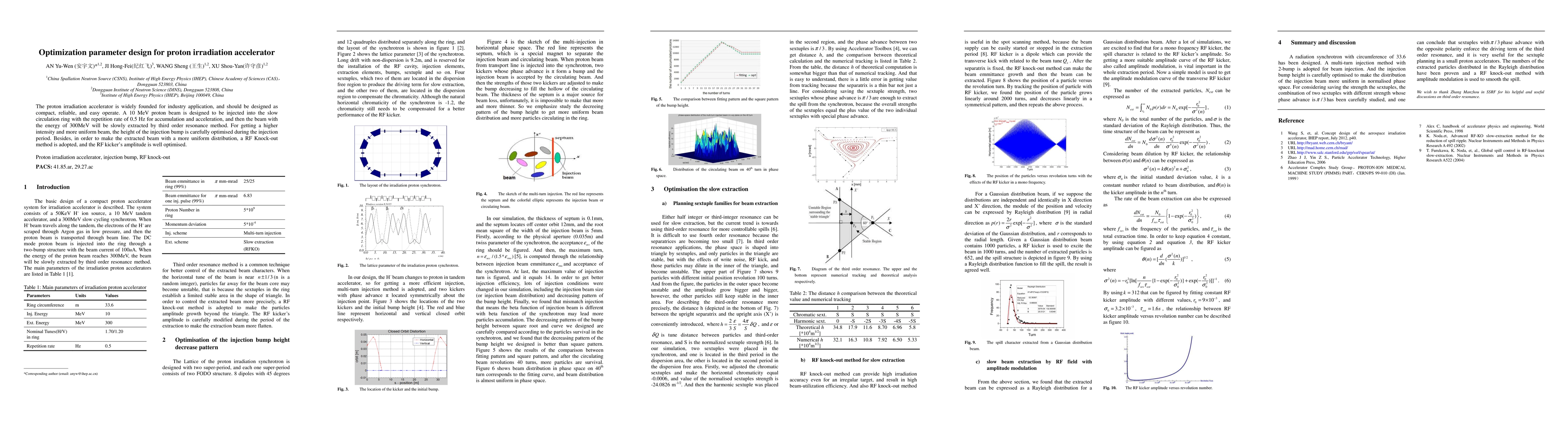 This research paper optimizes parameters for a proton irradiation accelerator to achieve higher intensity and more uniform beams, focusing on injection bump height and RF kicker amplitude for improved performance.