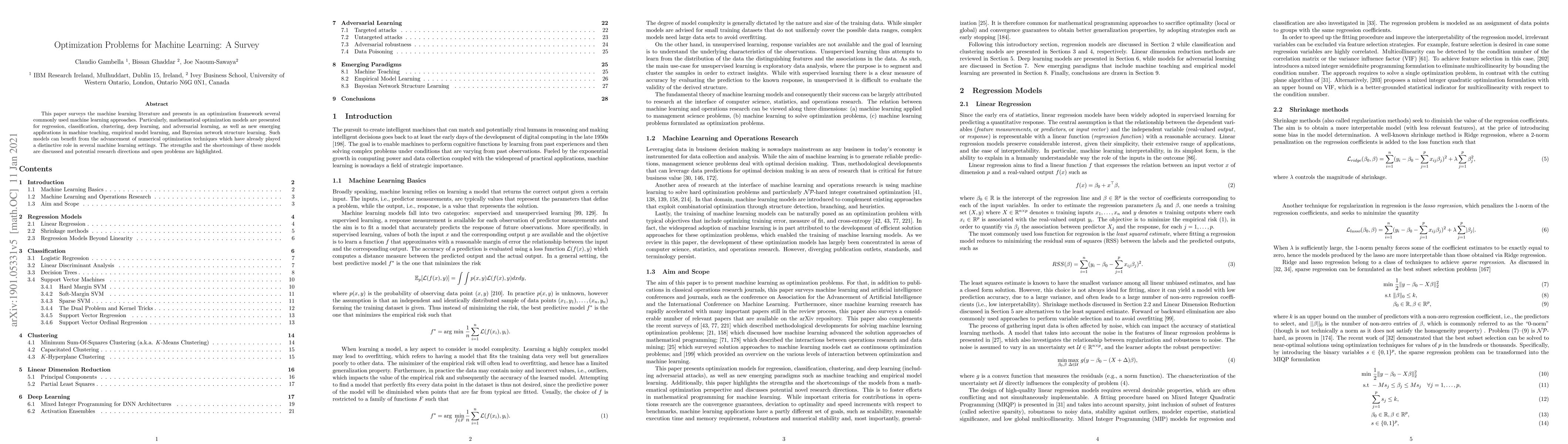 The paper presents a comprehensive survey of machine learning approaches within an optimization framework, discussing regression, classification, clustering, deep learning, adversarial learning, machine teaching, and empirical model learning, benefiting from advancements in numerical optimization techniques.