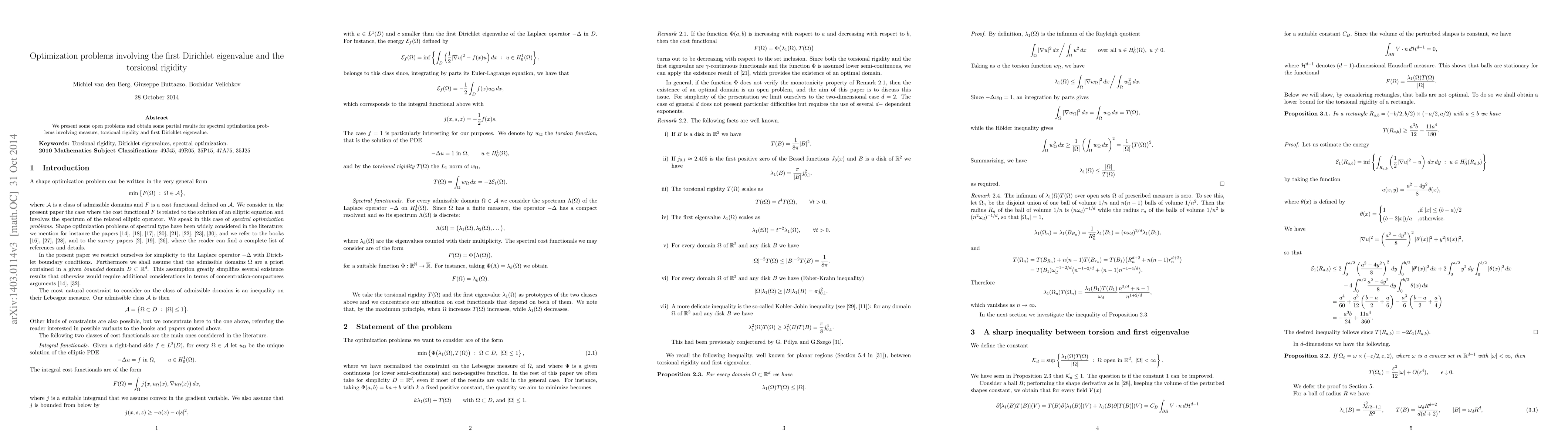 The paper presents open problems and partial results for spectral optimization problems involving measure, torsional rigidity, and the first Dirichlet eigenvalue.