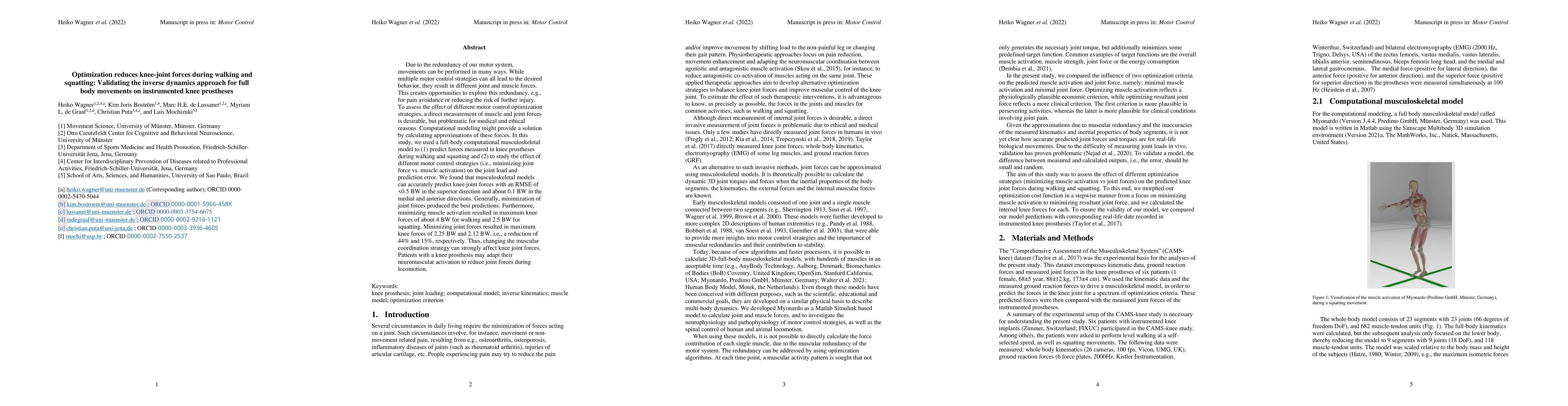 This study validates a computational musculoskeletal model to predict knee joint forces during walking and squatting, finding that optimization strategies minimizing joint forces significantly reduce knee forces compared to those minimizing muscle activation. The model accurately predicts knee forces with an RMSE of <0.5 BW in the superior direction and about 0.1 BW in the medial and anterior directions.