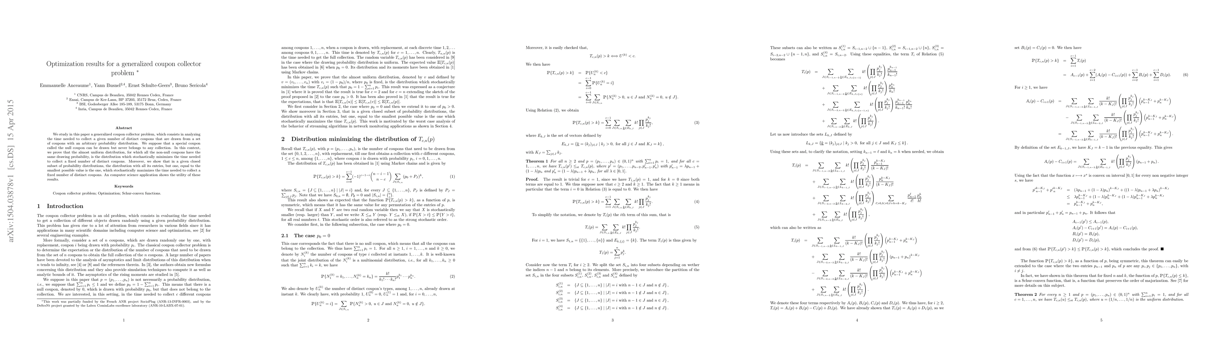We study in this paper a generalized coupon collector problem, which consists in analyzing the time needed to collect a given number of distinct coupons that are drawn from a set of coupons with an arbitrary probability distribution. We suppose that a special coupon called the null coupon can be drawn but never belongs to any collection. In this context, we prove that the almost uniform distribution, for which all the non-null coupons have the same drawing probability, is the distribution which stochastically minimizes the time needed to collect a fixed number of distinct coupons. Moreover, we show that in a given closed subset of probability distributions, the distribution with all its entries, but one, equal to the smallest possible value is the one, which stochastically maximizes the time needed to collect a fixed number of distinct coupons. An computer science application shows the utility of these results.