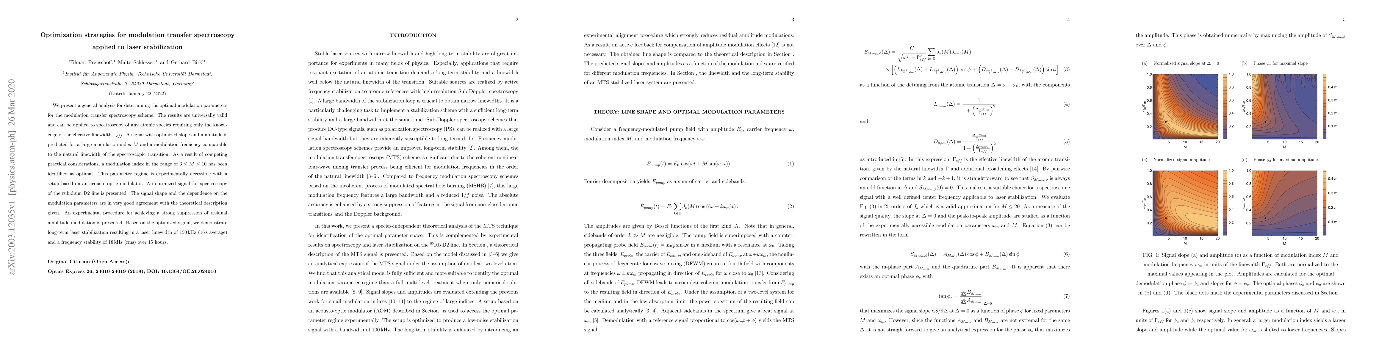 This paper analyzes optimal modulation parameters for modulation transfer spectroscopy, identifying a modulation index range of 3 to 10 for best results. It demonstrates long-term laser stabilization with a linewidth of 150 kHz and frequency stability of 18 kHz over 15 hours, validating the theoretical approach.