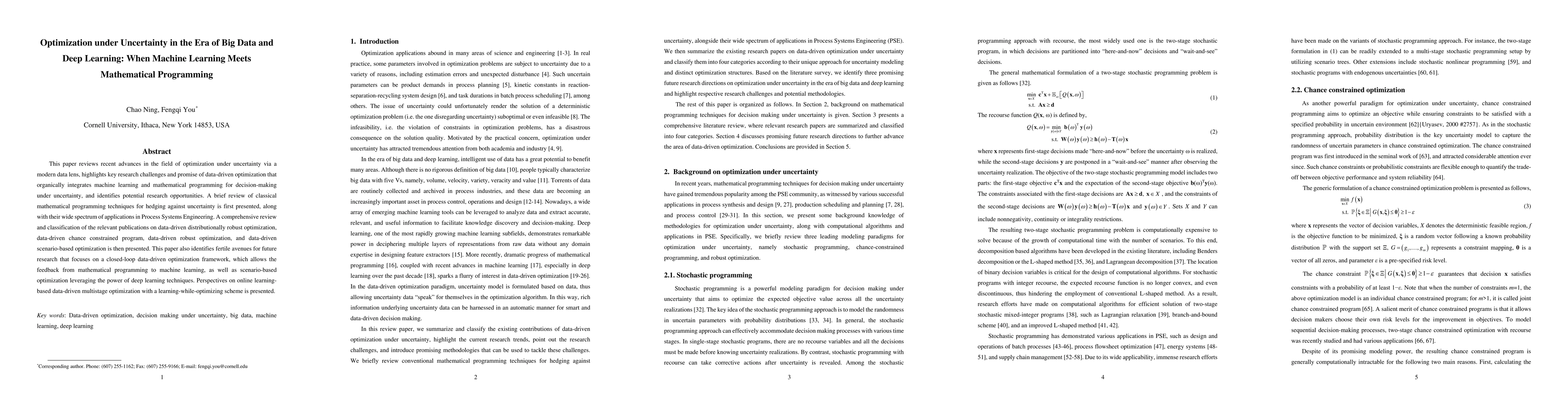 This paper reviews advances in optimization under uncertainty integrating machine learning and mathematical programming, highlighting key challenges and opportunities in data-driven approaches. It identifies future research avenues focusing on closed-loop frameworks and deep learning for scenario-based optimization.