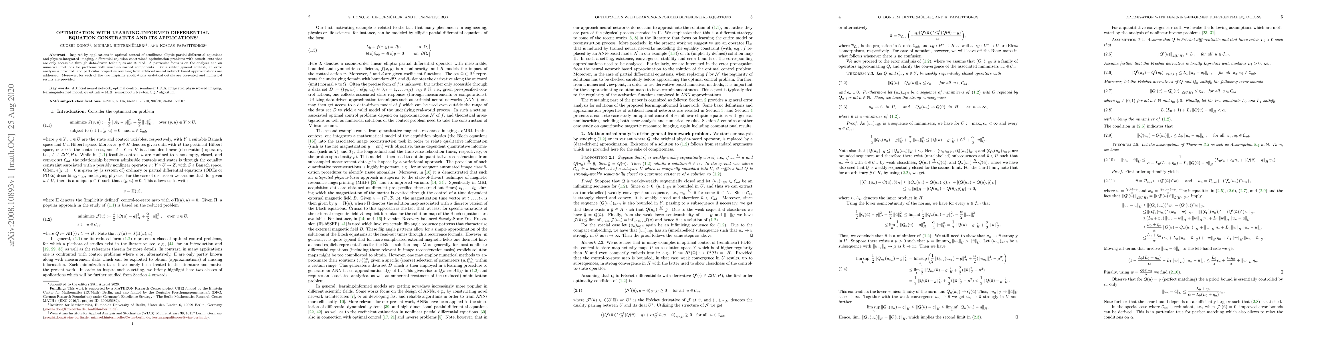 Inspired by applications in optimal control of semilinear elliptic partial differential equations and physics-integrated imaging, differential equation constrained optimization problems with constituents that are only accessible through data-driven techniques are studied. A particular focus is on the analysis and on numerical methods for problems with machine-learned components. For a rather general context, an error analysis is provided, and particular properties resulting from artificial neural network based approximations are addressed. Moreover, for each of the two inspiring applications analytical details are presented and numerical results are provided.
