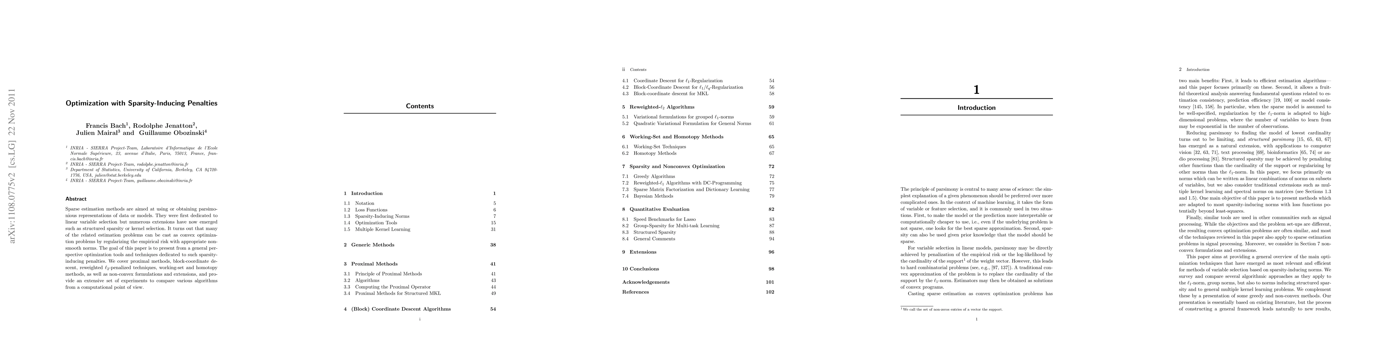 Sparse estimation methods are aimed at using or obtaining parsimonious representations of data or models. They were first dedicated to linear variable selection but numerous extensions have now emerged such as structured sparsity or kernel selection. It turns out that many of the related estimation problems can be cast as convex optimization problems by regularizing the empirical risk with appropriate non-smooth norms. The goal of this paper is to present from a general perspective optimization tools and techniques dedicated to such sparsity-inducing penalties. We cover proximal methods, block-coordinate descent, reweighted $\ell_2$-penalized techniques, working-set and homotopy methods, as well as non-convex formulations and extensions, and provide an extensive set of experiments to compare various algorithms from a computational point of view.