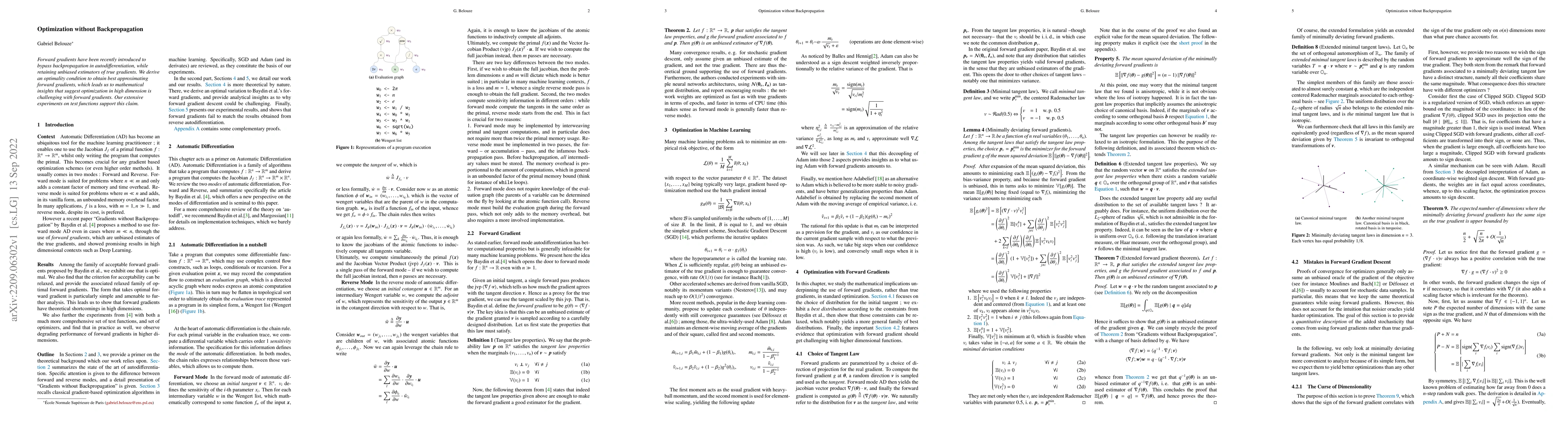 This paper explores the use of forward gradients to optimize functions without backpropagation, deriving an optimality condition for best approximating forward gradients. Experimental results indicate that optimization in high dimensions is challenging with this approach.