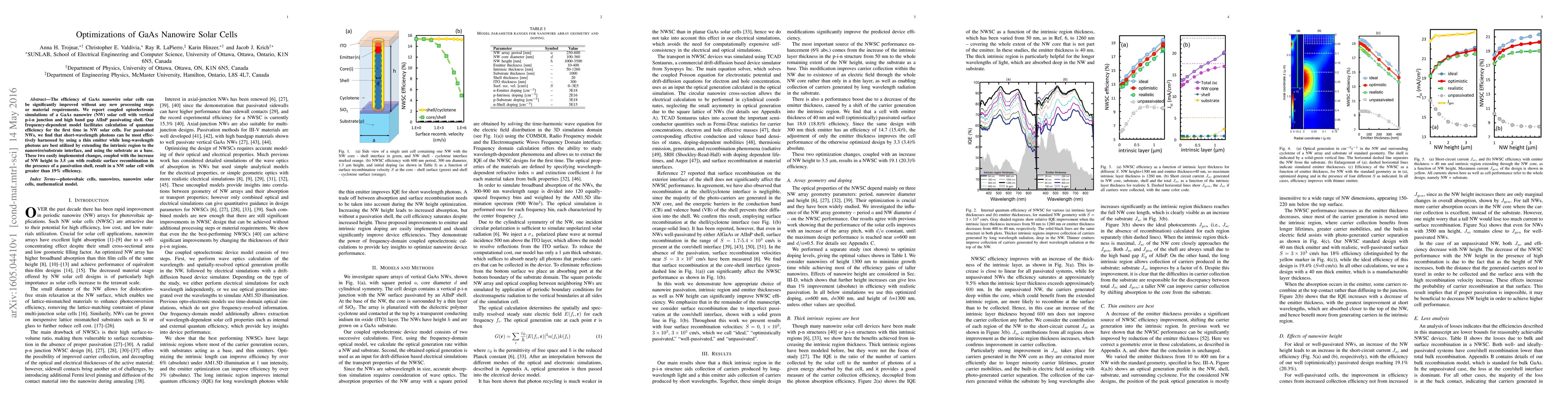 This paper optimizes GaAs nanowire solar cells by employing a vertical p-i-n junction and an AlInP passivating shell, achieving over 19% efficiency through improved quantum efficiency and strategic adjustments to the emitter and intrinsic region lengths. The optimizations require no new materials or processing steps.