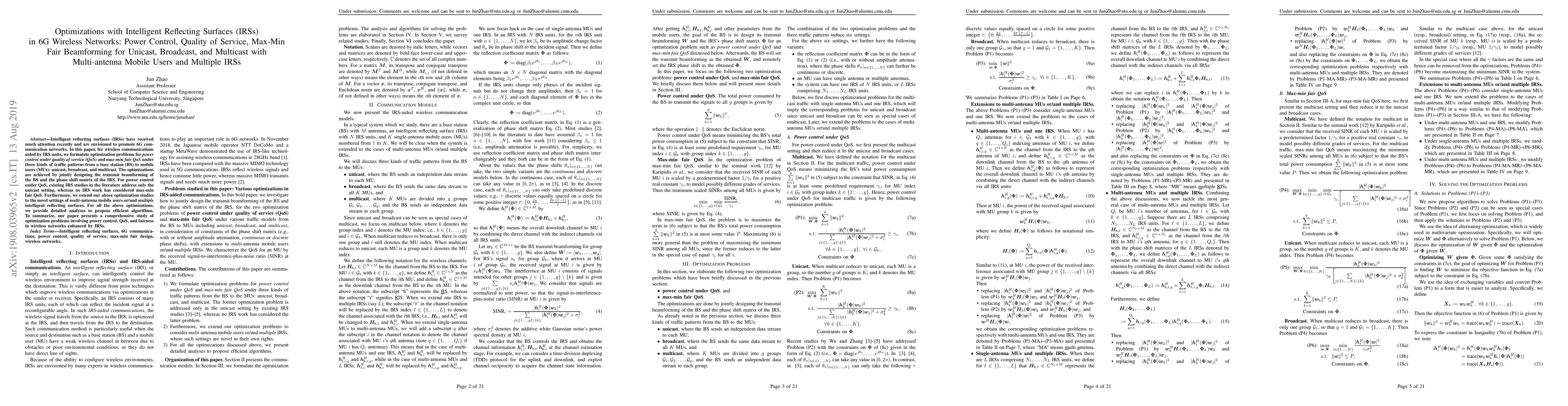 This paper formulates optimization problems for power control and max-min fair quality of service (QoS) in 6G networks enhanced by intelligent reflecting surfaces (IRSs), considering unicast, broadcast, and multicast traffic patterns. It proposes efficient algorithms for these optimizations, extending existing studies to multi-antenna mobile users and multiple IRSs.