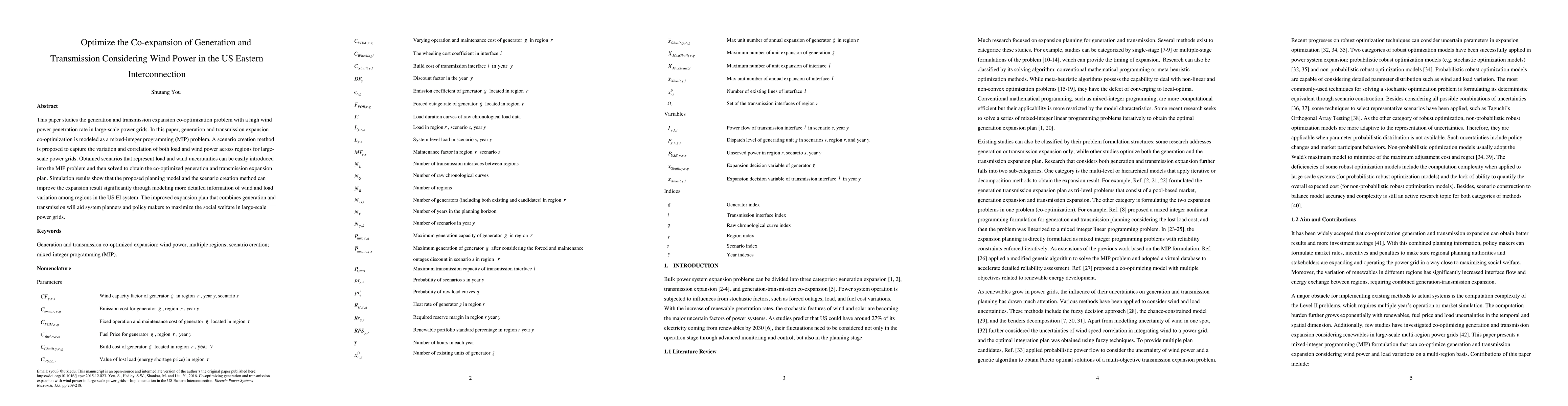 This paper proposes a mixed-integer programming model for co-optimization of generation and transmission expansion in large-scale power grids with high wind power penetration. It introduces a scenario creation method to capture regional load and wind power variations, leading to improved expansion plans that maximize social welfare.