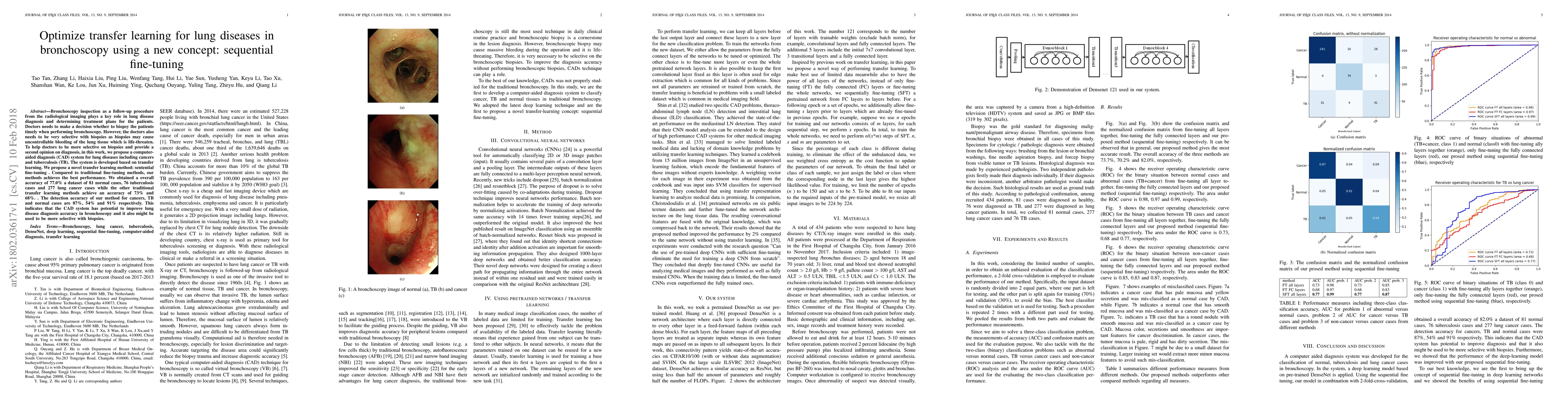 Bronchoscopy inspection as a follow-up procedure from the radiological imaging plays a key role in lung disease diagnosis and determining treatment plans for the patients. Doctors needs to make a decision whether to biopsy the patients timely when performing bronchoscopy. However, the doctors also needs to be very selective with biopsies as biopsies may cause uncontrollable bleeding of the lung tissue which is life-threaten. To help doctors to be more selective on biopsies and provide a second opinion on diagnosis, in this work, we propose a computer-aided diagnosis (CAD) system for lung diseases including cancers and tuberculosis (TB). The system is developed based on transfer learning. We propose a novel transfer learning method: sentential fine-tuning . Compared to traditional fine-tuning methods, our methods achieves the best performance. We obtained a overall accuracy of 77.0% a dataset of 81 normal cases, 76 tuberculosis cases and 277 lung cancer cases while the other traditional transfer learning methods achieve an accuracy of 73% and 68%. . The detection accuracy of our method for cancers, TB and normal cases are 87%, 54% and 91% respectively. This indicates that the CAD system has potential to improve lung disease diagnosis accuracy in bronchoscopy and it also might be used to be more selective with biopsies.