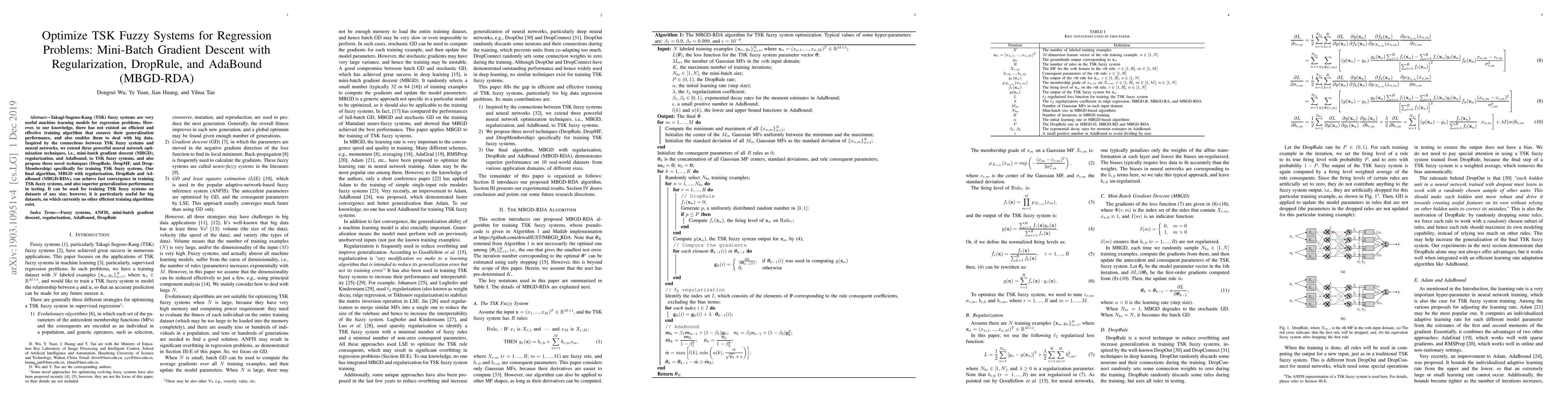 This paper proposes an optimized training algorithm, MBGD-RDA, for Takagi-Sugeno-Kang (TSK) fuzzy systems, integrating mini-batch gradient descent, regularization, DropRule, and AdaBound to enhance both training speed and generalization performance, especially for large datasets. The novel techniques specifically designed for TSK fuzzy systems enable efficient training on big data.